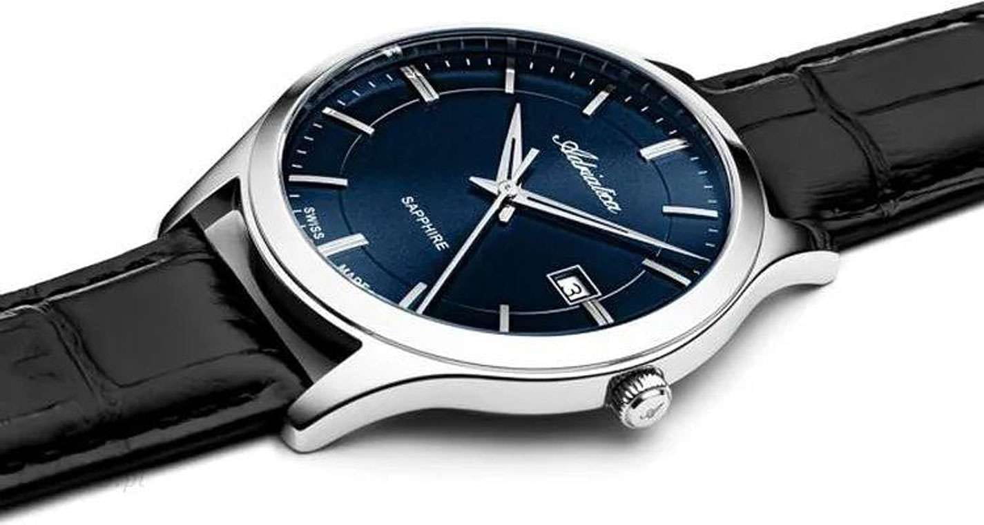 Женские швейцарские часы Adriatica Classic A3195.5215Q имеют кварцевый механизм с высокой точностью. Корпус часов изготовлен из нержавеющей стали. Сапфировое стеклоСапфировое стеклоПрочный и надёжный материал из кристалла сапфира синтетического происхождения, характеризующийся особой твёрдостью и устойчивостью к царапинам и повреждениям. устойчивое к появлению царапин, обладающее высокой прозрачностью, защищает синий циферблат, на котором расположилось окошко даты в районе 3 часа. Кожаный черный ремешок со стандартной застежкой обеспечивает комфортное ношение и подчеркивает стильный внешний вид. Надежный кварцевый механизм с калибром RONDA 785 гарантирует точность времени, а водозащита 50 метров, что позволит защитить корпус от случайных брызг или капель дождя.