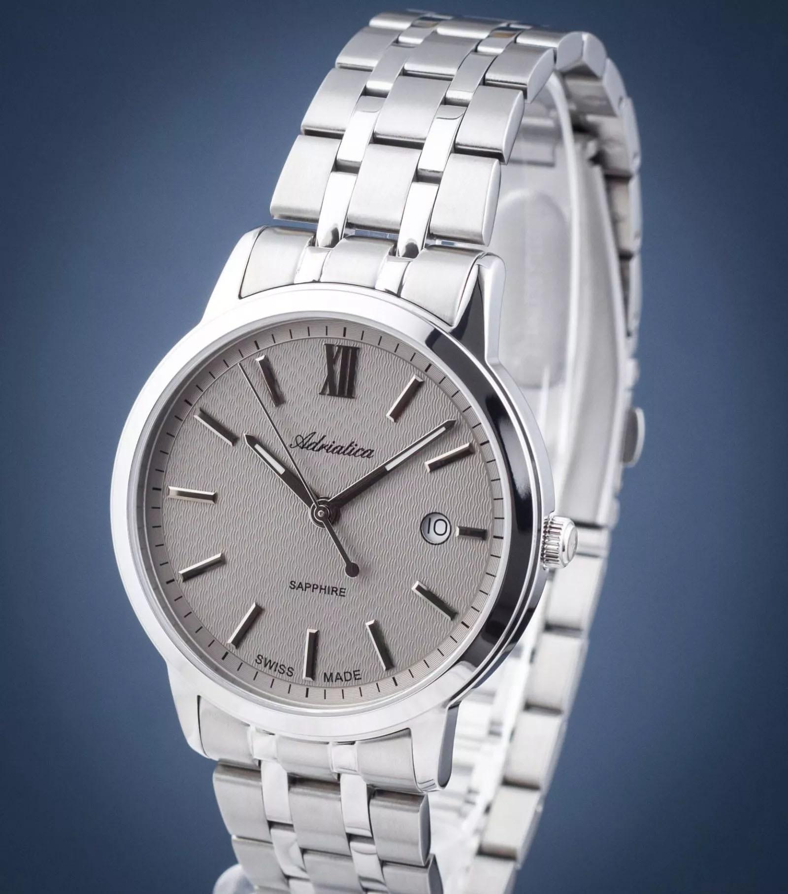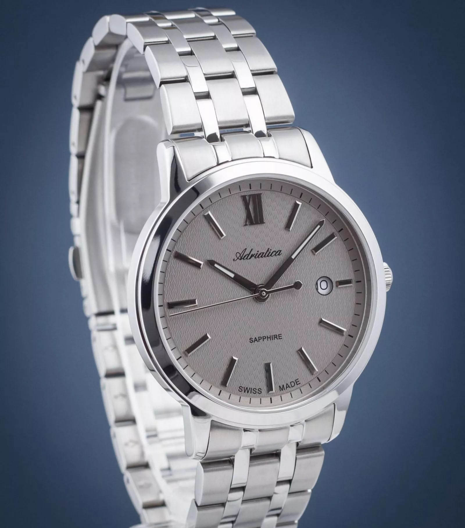 Мужские швейцарские кварцевые часы Adriatica A8333.5167Q кварцевый механизм с высокой точностью. Сапфировое стеклоСапфировое стеклоПрочный и надёжный материал из кристалла сапфира синтетического происхождения, характеризующийся особой твёрдостью и устойчивостью к царапинам и повреждениям. устойчивое к появлению царапин, обладающее высокой прозрачностью. Класс водозащиты: 30 метров, позволит защитить корпус от случайных брызг или капель дождя. Корпус часов изготовлен из стали. Стальной браслет на раскладной застёжкеРаскладная застёжкаТакой тип застёжки используется только на браслетах из металла. Она никогда не раскрывается полностью, происходит разделение на 2 и более частей. Раскладывающая застёжка снизит вероятность потери часов к минимуму.. Стрелки с люминесцентным покрытиемЛюминесцентное покрытиеПозволяет считывать показания времени в темноте. Производители наносят на стрелки, часовые индексы, безель или поверхность циферблата светонакопительный состав, дающий холодное свечение.. Окошко даты находится в положении 3 часа.