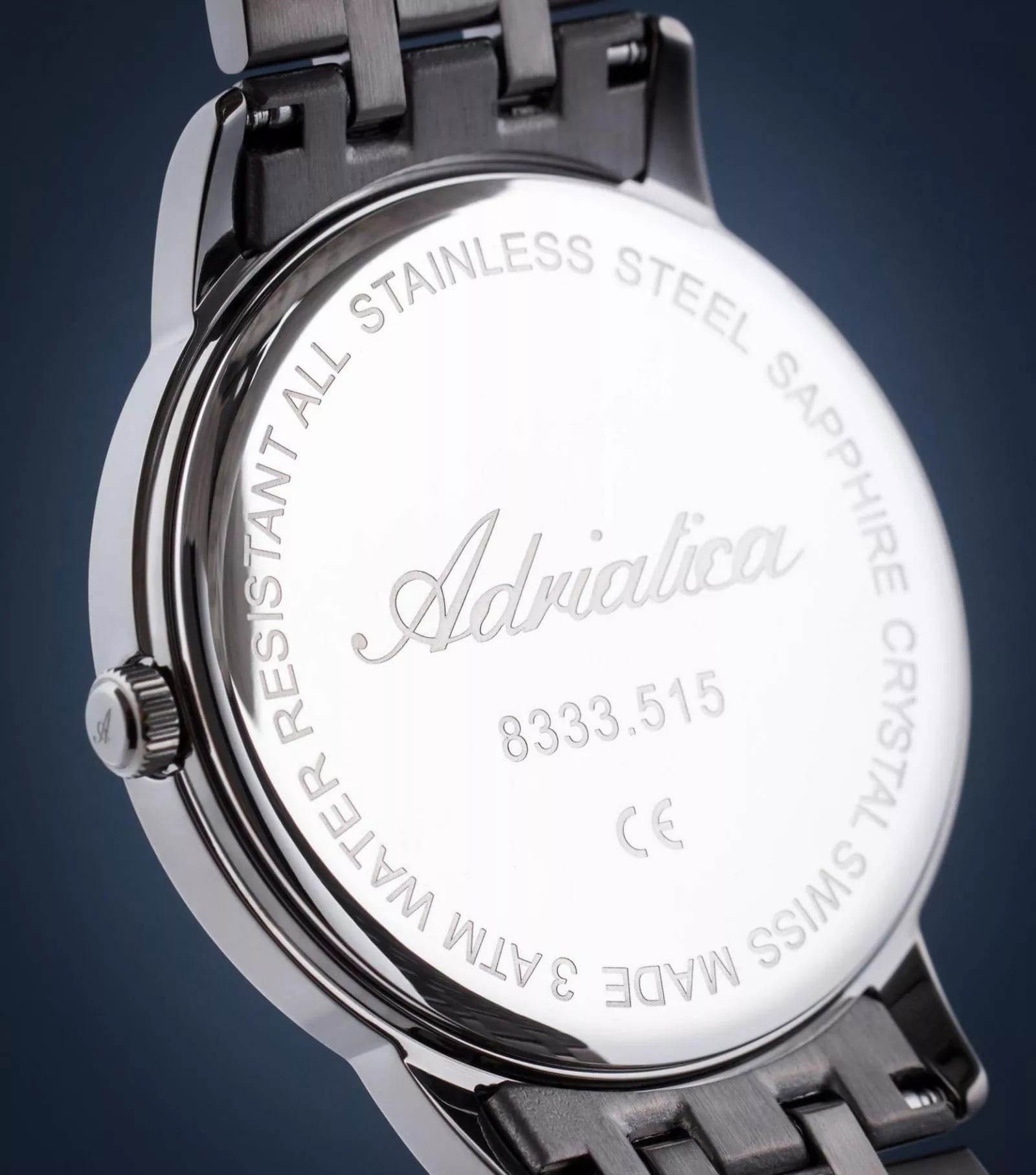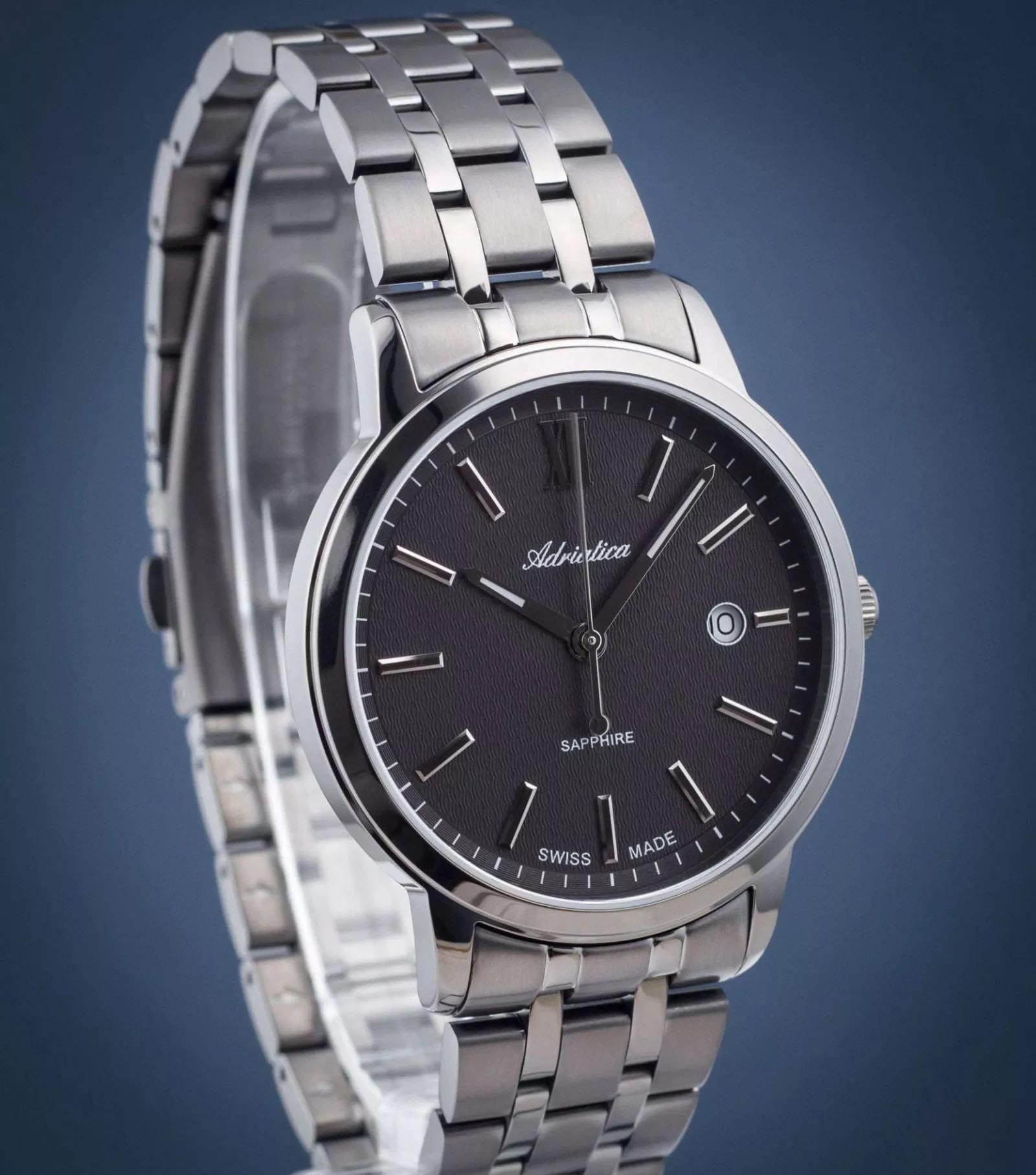 Мужские швейцарские кварцевые часы Adriatica A8333.S166Q, кварцевый механизм с высокой точностью. Сапфировое стеклоСапфировое стеклоПрочный и надёжный материал из кристалла сапфира синтетического происхождения, характеризующийся особой твёрдостью и устойчивостью к царапинам и повреждениям. устойчивое к появлению царапин, обладающее высокой прозрачностью. Класс водозащиты: 30 метров, позволит защитить корпус от случайных брызг или капель дождя. Корпус часов изготовлен из стали с PVD-покрытиемPVDУльтратонкое покрытие наносится в технике вакуумного напыления, сочетает в себе нитрид титана особой прочности со слоем золота или оксида хрома. Несёт в себе декоративную или защитную функцию.. Стальной браслет на раскладной застёжкеРаскладная застёжкаТакой тип застёжки используется только на браслетах из металла. Она никогда не раскрывается полностью, происходит разделение на 2 и более частей. Раскладывающая застёжка снизит вероятность потери часов к минимуму. с PVD-покрытиемPVDУльтратонкое покрытие наносится в технике вакуумного напыления, сочетает в себе нитрид титана особой прочности со слоем золота или оксида хрома. Несёт в себе декоративную или защитную функцию.. Стрелки с люминесцентным покрытиемЛюминесцентное покрытиеПозволяет считывать показания времени в темноте. Производители наносят на стрелки, часовые индексы, безель или поверхность циферблата светонакопительный состав, дающий холодное свечение.. Окошко даты находится в положении 3 часа.