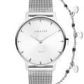 Amalys AMW-194 — женский набор, включающий часы и браслет, выполненный в едином элегантном стиле. Круглый корпус диаметром 33 мм изготовлен из нержавеющей стали, что подчёркивает изысканный характер модели. Защитную функцию выполняет сапфировое стеклоСапфировое стеклоПрочный и надёжный материал из кристалла сапфира синтетического происхождения, характеризующийся особой твёрдостью и устойчивостью к царапинам и повреждениям., стойкое к царапинам и сохраняющее прозрачность. Механизм — кварцевый, обеспечивающий точность хода и удобство в использовании. Водозащита 3 ATM защищает от случайных брызг и дождя. Циферблат оформлен в минималистичном стиле с тонкими метками и изящными стрелками, подчёркивающими женственный образ. Стальной браслет миланского плетения на раскладном замкеРаскладной замокДанный вариант застежки используется только на часах с металлическим браслетом. Отличительная особенность такого крепления в том, что длина браслета становится универсальной и вы можете самостоятельно отрегулировать нужный вам размер – застежка просто двигается по браслету часов. мягко облегает запястье и гармонично сочетается с корпусом. Дополняющий набор браслет усиливает впечатление цельности и придаёт образу завершённость.