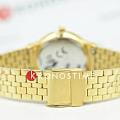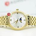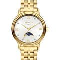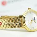 Amalys AMW-204 — женская модель с элегантным классическим стилем и утончёнными деталями. Круглый корпус изготовлен из нержавеющей стали с PVDPVDУльтратонкое покрытие наносится в технике вакуумного напыления, сочетает в себе нитрид титана особой прочности со слоем золота или оксида хрома. Несёт в себе декоративную или защитную функцию.-покрытием золотистого оттенка и гармонирует с браслетом в том же исполнении, состоящим из звеньев и обеспечивающим комфортное прилегание к запястью. Защитную функцию выполняет сапфировое стеклоСапфировое стеклоПрочный и надёжный материал из кристалла сапфира синтетического происхождения, характеризующийся особой твёрдостью и устойчивостью к царапинам и повреждениям., которое отличается стойкостью к царапинам и сохраняет высокую прозрачность. В основе лежит кварцевый механизм, гарантирующий точность хода и простоту эксплуатации. Циферблат украшен изящными римскими цифрами и метками, дополнен утончённым индикатором фаз Луны, который придаёт часам особый шарм и делает их акцентной деталью образа. Водозащита 3 ATM защищает от случайных брызг и дождя. Модель сочетает функциональность и изысканность, подойдёт как для повседневного стиля, так и для особых случаев.