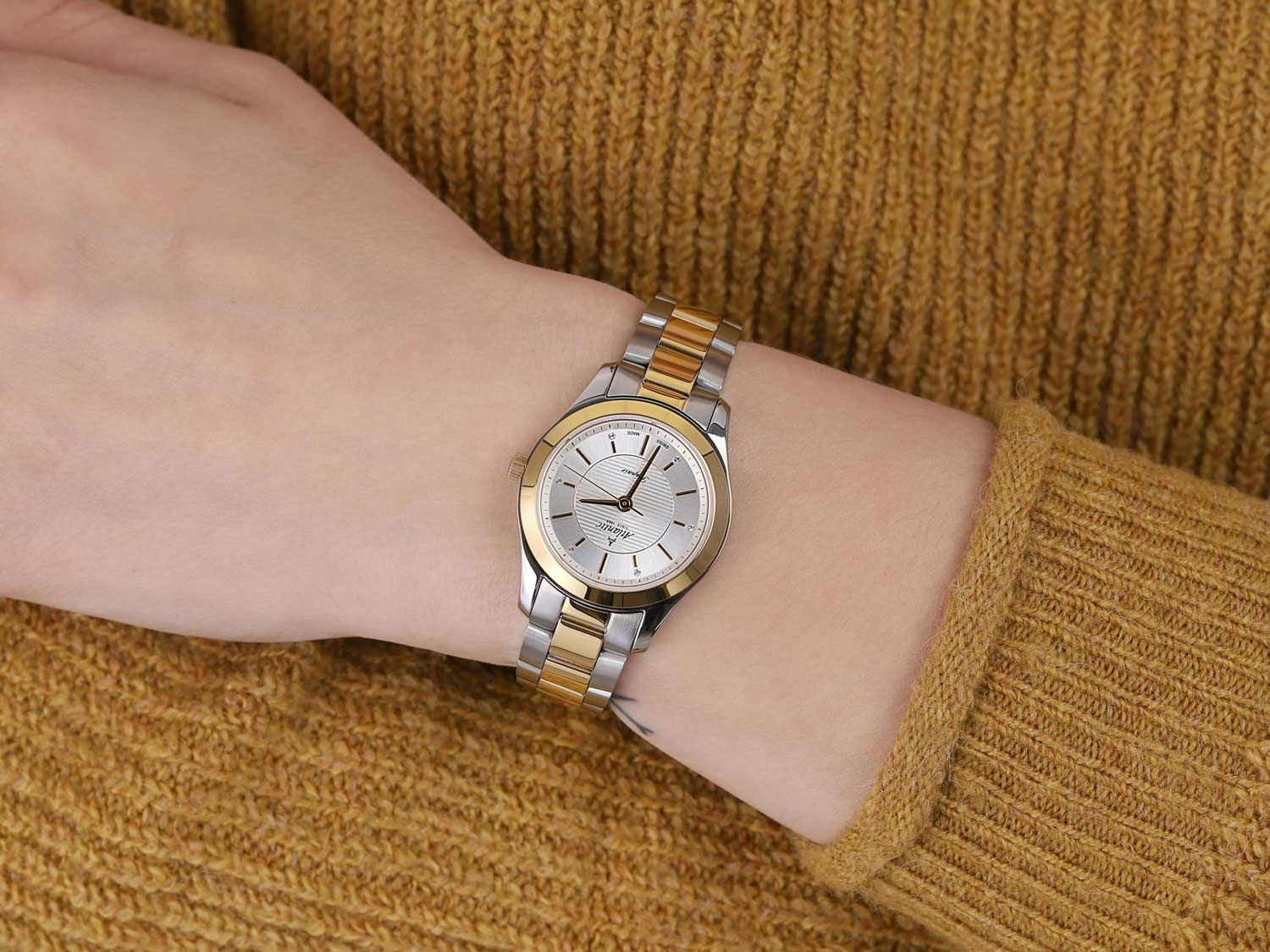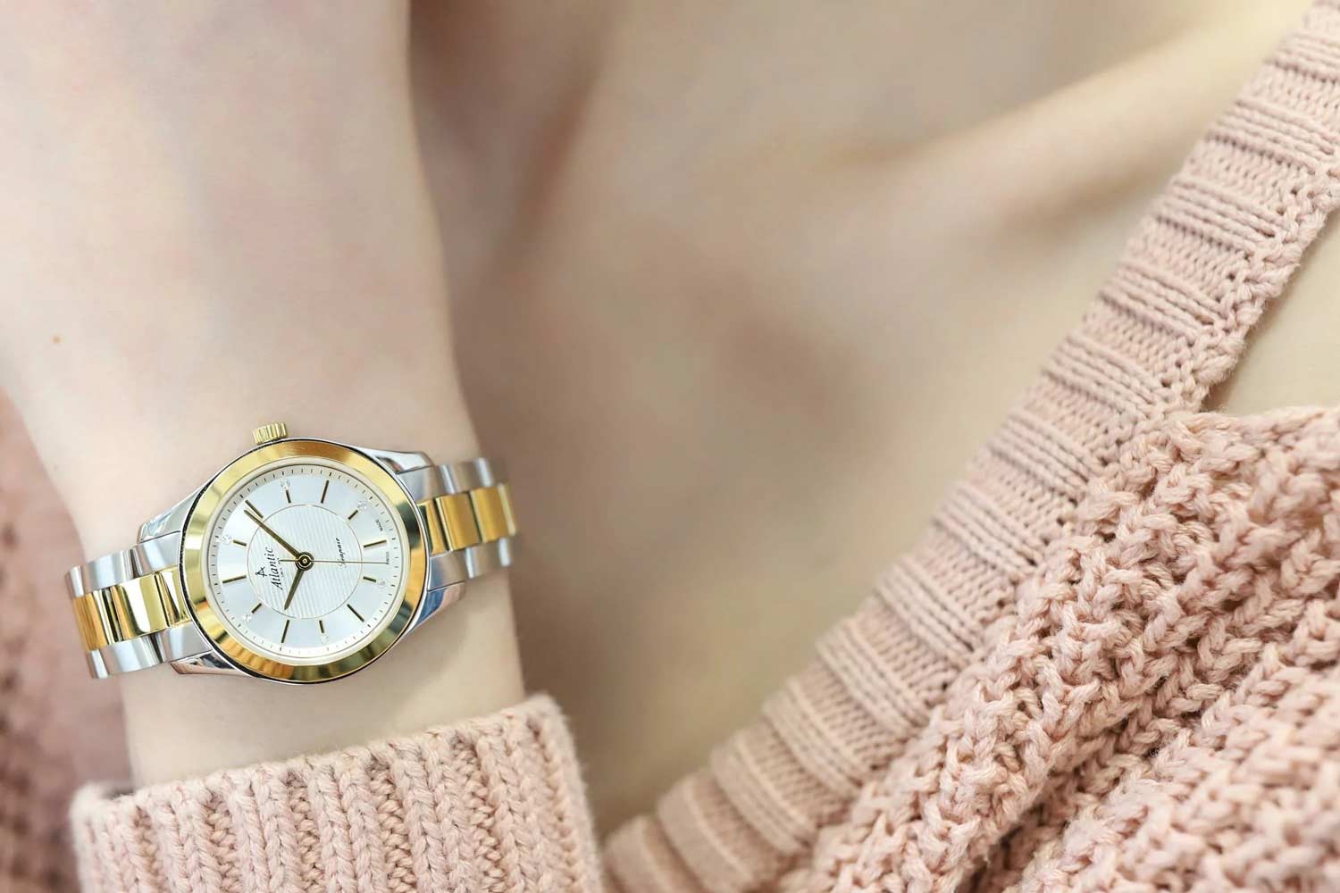 Женские швейцарские часы Atlantic Seapair Ladies 20335.43.21G, кварцевый механизм с высокой точностью. Циферблат часов с люминесцентным покрытиемЛюминесцентное покрытиеПозволяет считывать показания времени в темноте. Производители наносят на стрелки, часовые индексы, безель или поверхность циферблата светонакопительный состав, дающий холодное свечение. стрелок и меток, дополнен сапфировым стекломСапфировое стеклоПрочный и надёжный материал из кристалла сапфира синтетического происхождения, характеризующийся особой твёрдостью и устойчивостью к царапинам и повреждениям., устойчивым к появлению царапин и обладающее высокой прозрачностью. Класс водозащиты: 30 метров, позволит защитить корпус от случайных брызг или капель дождя. Корпус часов изготовлен из нержавеющей стали. Стальной браслет с раскладной застёжкойРаскладная застёжкаТакой тип застёжки используется только на браслетах из металла. Она никогда не раскрывается полностью, происходит разделение на 2 и более частей. Раскладывающая застёжка снизит вероятность потери часов к минимуму.. БезельБезельВнешний ободок, закрепляющий стекло. В спортивных часах так называется поворотное кольцо с делениями на циферблате, выполняет роль таймера – замеряет отрезки времени на шкале. Неподвижный безель – элемент декора. Однонаправленно вращающийся безель на дайверских часах позволяет фиксировать моменты погружения и выныривания на поверхность. с PVD-покрытиемPVDУльтратонкое покрытие наносится в технике вакуумного напыления, сочетает в себе нитрид титана особой прочности со слоем золота или оксида хрома. Несёт в себе декоративную или защитную функцию..