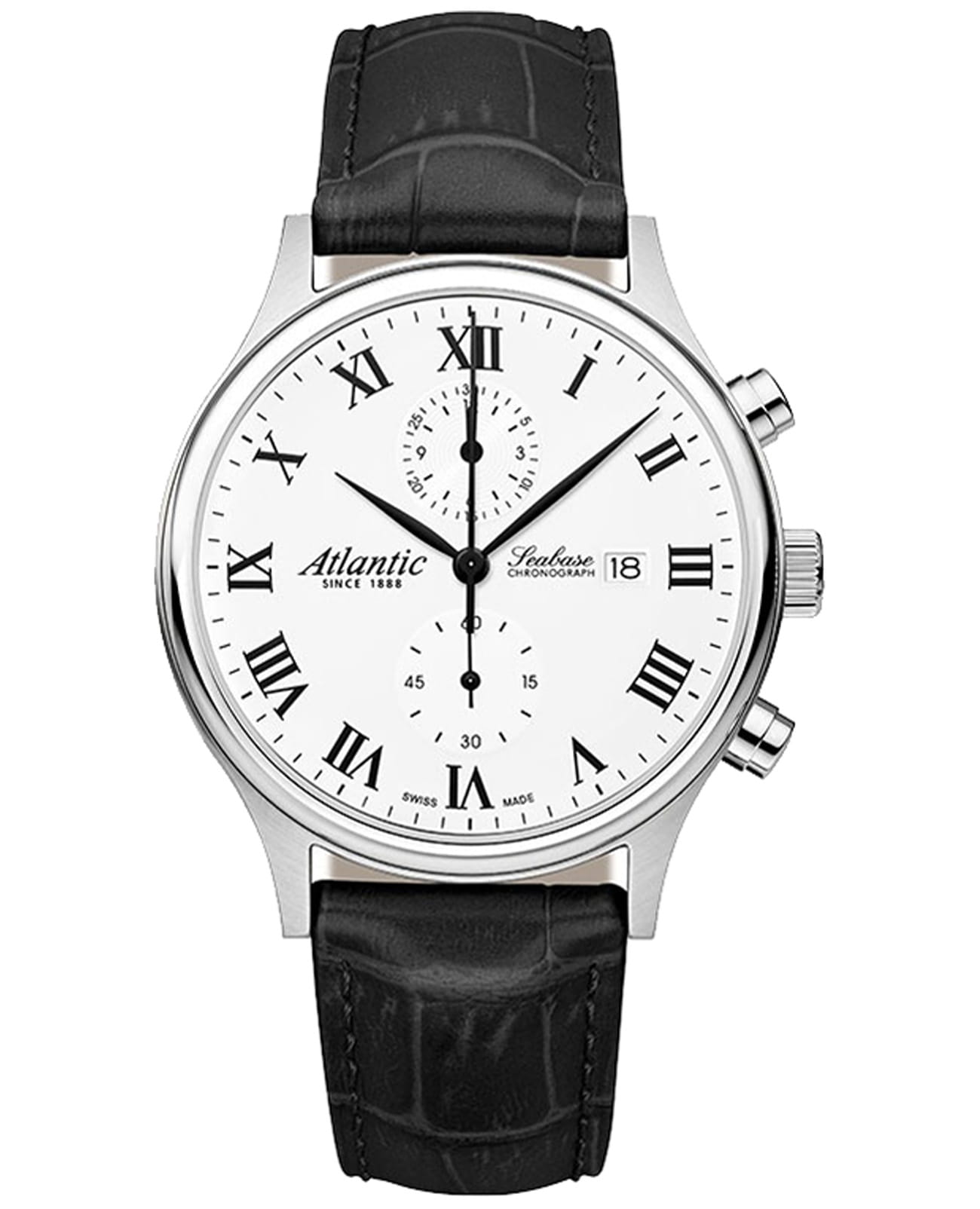 Мужские швейцарские часы-хронографХронографФункция позволяет измерять отрезки времени с особой точностью: часы, минуты, секунды. Верным признаком хронографа является наличие на циферблате 3 дополнительных окошек-счётчиков. с секундомеромСекундомерСекундоме́р — прибор, способный измерять интервалы времени с точностью до долей секунды. Atlantic Seabase 64452.41.18, кварцевый механизм с высокой точностью. Сапфировое стеклоСапфировое стеклоПрочный и надёжный материал из кристалла сапфира синтетического происхождения, характеризующийся особой твёрдостью и устойчивостью к царапинам и повреждениям. устойчивое к появлению царапин, обладающее высокой прозрачностью. Класс водозащиты: 50 метров, позволит защитить корпус от случайных брызг или капель дождя. Корпус часов изготовлен из стали. Кожаный ремешок на стандартной застёжке. Окошко даты находится в положении 3 часа.