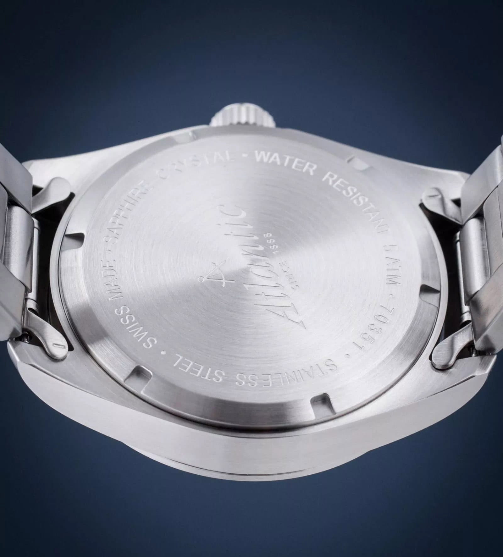Мужские швейцарские часы Atlantic Seaflight 70356.41.55, кварцевый механизм с высокой точностью. Сапфировое стеклоСапфировое стеклоПрочный и надёжный материал из кристалла сапфира синтетического происхождения, характеризующийся особой твёрдостью и устойчивостью к царапинам и повреждениям. устойчивое к появлению царапин, обладающее высокой прозрачностью. Класс водозащиты: 50 метров, позволит защитить корпус от случайных брызг или капель дождя. Корпус часов изготовлен из стали. Стальной браслет на раскладной застёжкеРаскладная застёжкаТакой тип застёжки используется только на браслетах из металла. Она никогда не раскрывается полностью, происходит разделение на 2 и более частей. Раскладывающая застёжка снизит вероятность потери часов к минимуму.. Окошко даты находится в положении 3 часа. Стрелки и метки с люминесцентным покрытиемЛюминесцентное покрытиеПозволяет считывать показания времени в темноте. Производители наносят на стрелки, часовые индексы, безель или поверхность циферблата светонакопительный состав, дающий холодное свечение..