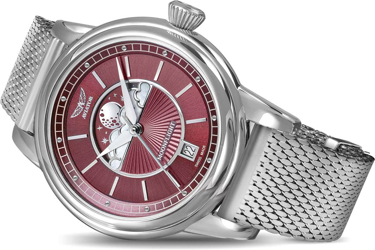 Aviator Douglas MoonFlight V.1.33.0.264.5 — элегантные дамские швейцарские часы с утончённой авиационной эстетикой. Корпус 36 мм из нержавеющей стали 316L обладает компактными пропорциями и удобным профилем. Циферблат в стиле Art Deco украшает усложнение фаз Луны в верхней половине, обрамлённой тонким кольцом облаков. Отмечено окно даты в положении «6 часов». Стрелки обработаны люминесцентным покрытиемЛюминесцентное покрытиеПозволяет считывать показания времени в темноте. Производители наносят на стрелки, часовые индексы, безель или поверхность циферблата светонакопительный состав, дающий холодное свечение. Superluminova — для уверенного считывания в темноте. Поверхность защищена сапфировым стекломСапфировое стеклоПрочный и надёжный материал из кристалла сапфира синтетического происхождения, характеризующийся особой твёрдостью и устойчивостью к царапинам и повреждениям. с антибликовым покрытиемАнтибликовое покрытиеСлой оксида металла в 0,13-0,3 микрон, благодаря которому стекло часов не бликует и не отражает свет. Антибликовое покрытие уменьшает отражение света в 10 раз, обеспечивая отличную читаемость показателей циферблата.. Сердце модели — швейцарский кварцевый механизм Ronda 708 с функцией отображения лунных фаз, 13 рубинами и возможностью работать до 54 месяцев без замены батареи. Завинчивающаяся задняя крышка с гравировкой Douglas DC-3 и герметичность до 100 метров создают надёжную основу для эксплуатации. Стальной браслет миланского плетения на раскладном замкеРаскладной замокДанный вариант застежки используется только на часах с металлическим браслетом. Отличительная особенность такого крепления в том, что длина браслета становится универсальной и вы можете самостоятельно отрегулировать нужный вам размер – застежка просто двигается по браслету часов., сочетая комфорт, элегантность и практичность. Лимитированная серия - 950 экземпляров. Aviator Douglas MoonFlight — это гармоничное сочетание авиационного наследия, женской элегантности и технической изысканности, воплощённое в элегантном и функциональном аксессуаре.