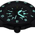 Циферблат отличается детальной функциональностью: в центре — крупные арабские цифры и стрелки, покрытые люминесцентным покрытиемЛюминесцентное покрытиеПозволяет считывать показания времени в темноте. Производители наносят на стрелки, часовые индексы, безель или поверхность циферблата светонакопительный состав, дающий холодное свечение., обеспечивающими мгновенное считывание времени даже в темноте. На «3 часах» — окошко даты, а индикатор второго часового пояса (GMT) удобно расположен на «9 часах». С внешней стороны — вращающийся безельБезельВнешний ободок, закрепляющий стекло. В спортивных часах так называется поворотное кольцо с делениями на циферблате, выполняет роль таймера – замеряет отрезки времени на шкале. Неподвижный безель – элемент декора. Однонаправленно вращающийся безель на дайверских часах позволяет фиксировать моменты погружения и выныривания на поверхность. с PVD-покрытиемPVDУльтратонкое покрытие наносится в технике вакуумного напыления, сочетает в себе нитрид титана особой прочности со слоем золота или оксида хрома. Несёт в себе декоративную или защитную функцию. с насечкой и градусной шкалой для секунд — идеален для расчёта времени пути или времени прибытия  .