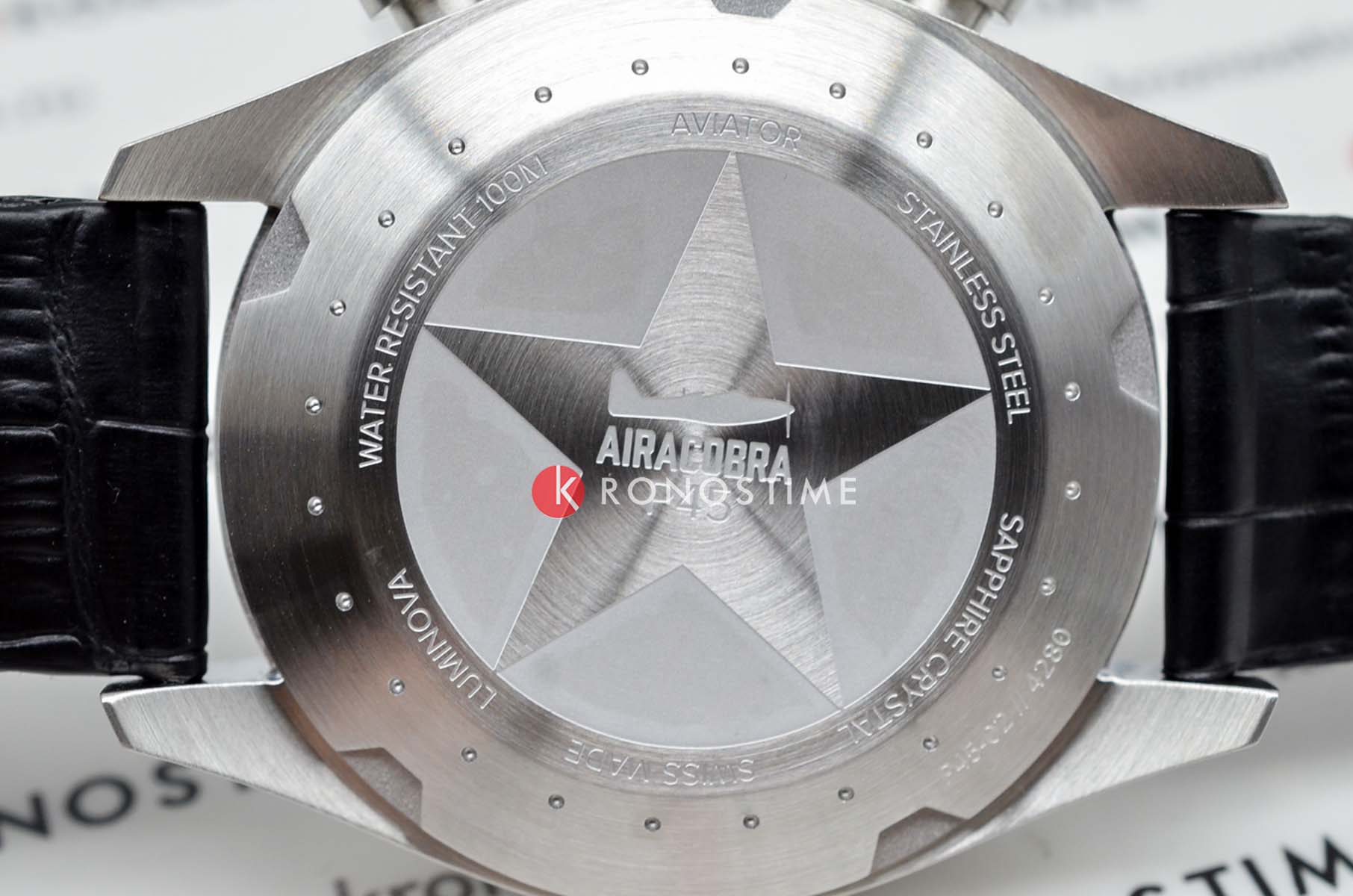 Aviator Airacobra V.2.25.0.169.4 — швейцарский GMT-хронограф в духе пилотских инструментов, объединяющий точность, удобство и лаконичный дизайн. Диаметр корпуса — 45 мм, выполнен из нержавеющей стали, что подчёркивает техническую надёжность в образе часов.