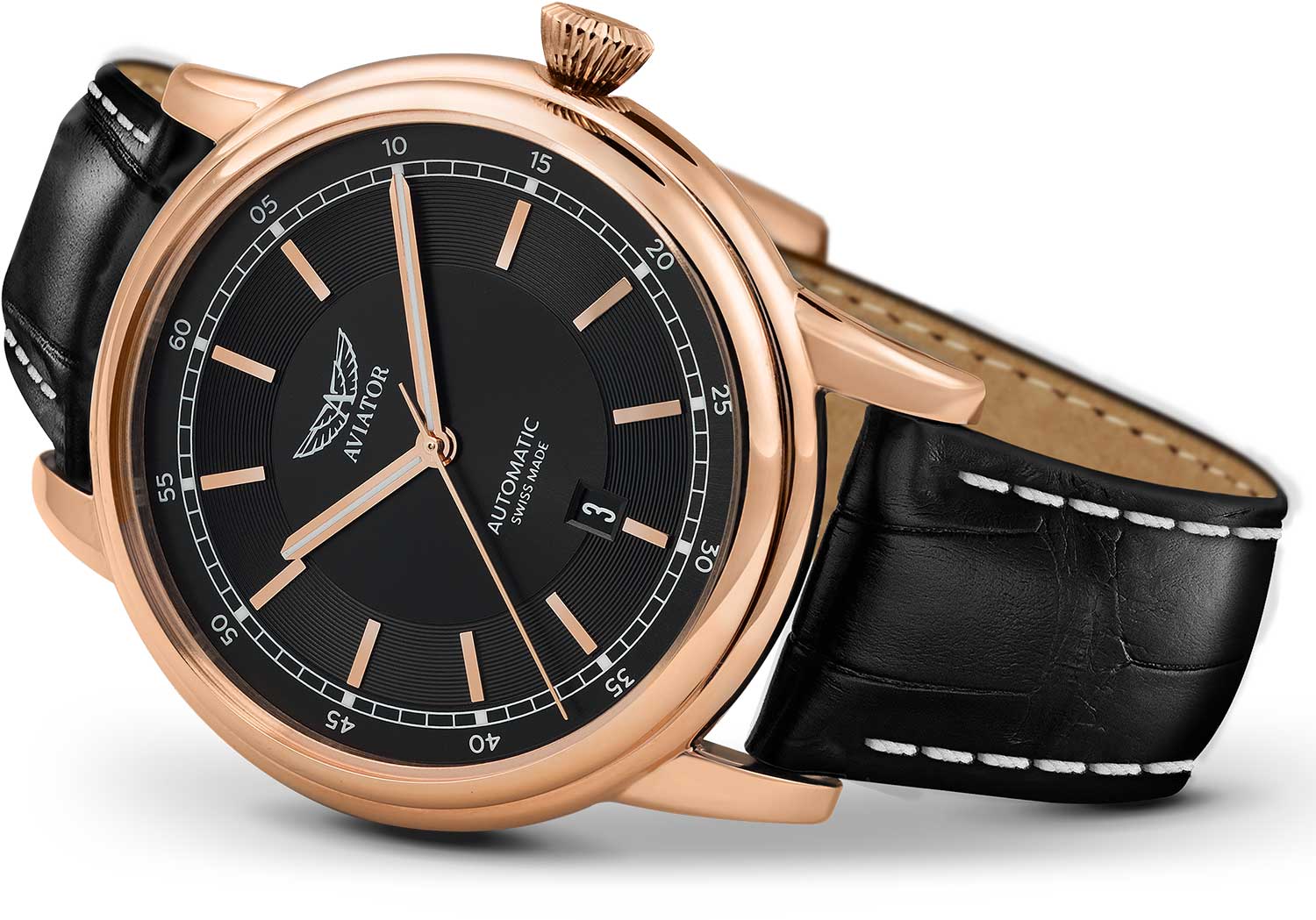 Aviator Douglas DC-3 V.3.32.2.242.4 — швейцарские часы в классике авиадизайна, сочетающие безупречную читаемость и высокую надёжность. Лимитированная серия. Корпус диаметром 45 мм выполнен из нержавеющей стали 316L с PVD-покрытиемPVDУльтратонкое покрытие наносится в технике вакуумного напыления, сочетает в себе нитрид титана особой прочности со слоем золота или оксида хрома. Несёт в себе декоративную или защитную функцию. цвета розового золота. Накладные метки выполнены в виде штрихов. Окошко даты находится в положении 6 часов. Часовые метки и стрелки покрыты люминесцентным покрытиемЛюминесцентное покрытиеПозволяет считывать показания времени в темноте. Производители наносят на стрелки, часовые индексы, безель или поверхность циферблата светонакопительный состав, дающий холодное свечение. Superluminova, позволяющим легко определять время даже в тёмное время суток. Поверхность защищена прочным сапфировым стекломСапфировое стеклоПрочный и надёжный материал из кристалла сапфира синтетического происхождения, характеризующийся особой твёрдостью и устойчивостью к царапинам и повреждениям. с антибликовым покрытием, устойчивым к царапинам. Сердце модели — швейцарский механизм Sellita SW 200, известный своей точностью и долговечностью. Водозащита 100 метров, позволит плавать, нырять и заниматься другими водными видами спорта. Завинчивающаяся головка и задняя крышка обеспечивают уверенную ударопрочностьУдаропрочный корпусМеханизм заключён в корпус, выполненный из современных материалов, устойчивых к ударам, механическим повреждениям и падению с высоты: инновационный пластик, карбон, нержавеющая сталь, титан. и надёжную защиту от влаги и пыли. В механизме 26 камней, запас хода 38 часов. Модель дополнена кожаным ремешком с выразительной текстурой и классическим стилем, закреплённым с помощью застёжке-бабочке с кнопкамиЗастёжка "бабочка"Такой вид застёжки дополняется предохранителями, помогающими избежать случайного раскрытия браслета. Обладают изящным исполнением. — для максимального комфорта и лёгкости в повседневном использовании. Циферблат выполнен по технологии sun-ray (солнечные лучи). Коллекция Douglas была разработана в честь известного американского пассажирского самолета Douglas DC-3. Aviator — это образец лётной точности, инженерной чёткости и сдержанной роскоши, идеально подходящий для тех, кто ценит функциональность и уверенность в каждом элементе.