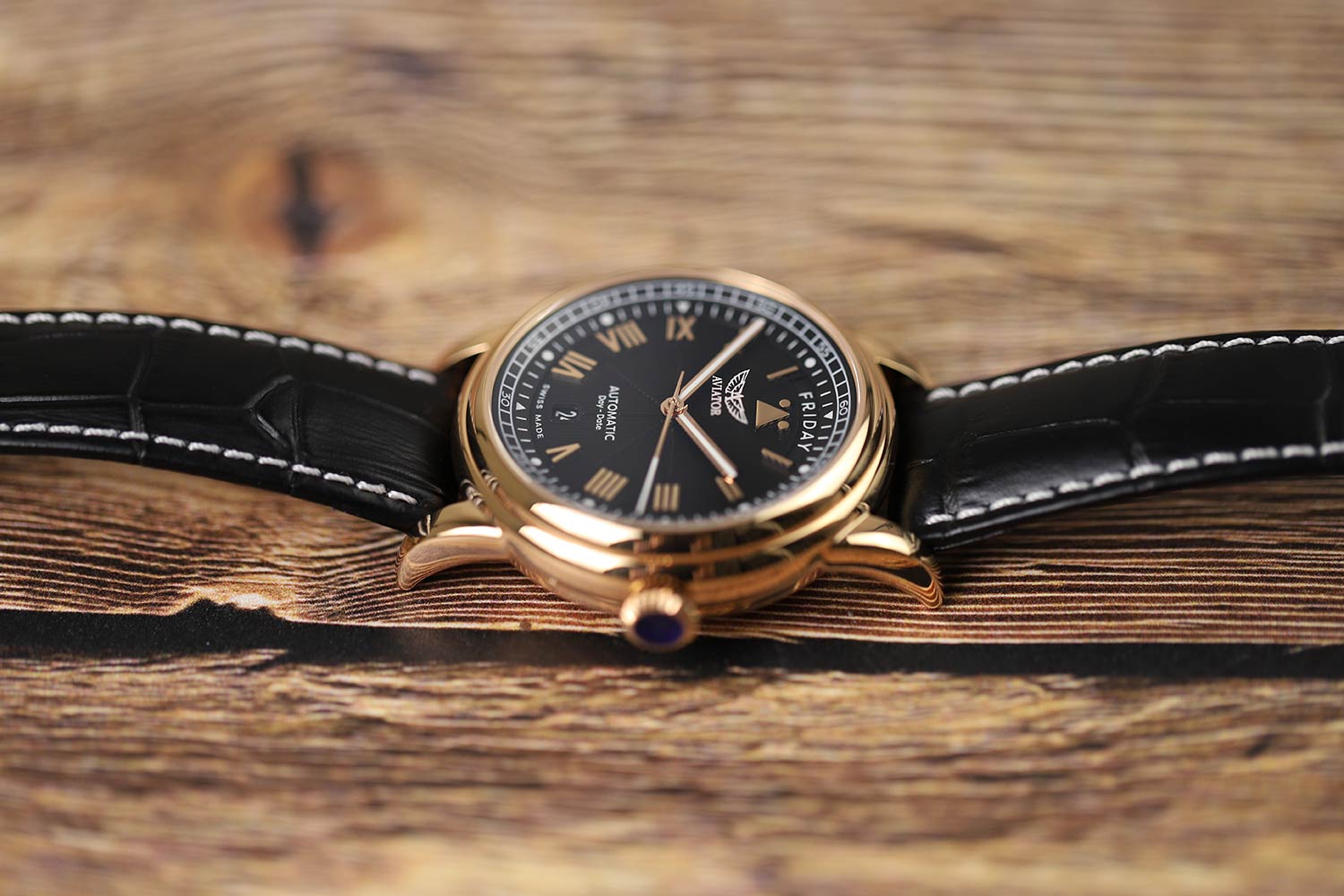 Aviator Douglas Day Date V.3.35.2.275.4 — швейцарские часы в классике авиадизайна, сочетающие безупречную читаемость и высокую надёжность. Лимитированная серия – 950 экземпляров. Корпус диаметром 41,2 мм выполнен из нержавеющей стали 316L с PVD-покрытиемPVDУльтратонкое покрытие наносится в технике вакуумного напыления, сочетает в себе нитрид титана особой прочности со слоем золота или оксида хрома. Несёт в себе декоративную или защитную функцию. цвета розового золота. Накладные метки выполнены в виде римских цифр. Окошко даты находится в положении 6 часов. День недели находится в положении 12 часов. Часовые метки и стрелки покрыты люминесцентным покрытиемЛюминесцентное покрытиеПозволяет считывать показания времени в темноте. Производители наносят на стрелки, часовые индексы, безель или поверхность циферблата светонакопительный состав, дающий холодное свечение. Superluminova, позволяющим легко определять время даже в тёмное время суток. Поверхность защищена прочным сапфировым стекломСапфировое стеклоПрочный и надёжный материал из кристалла сапфира синтетического происхождения, характеризующийся особой твёрдостью и устойчивостью к царапинам и повреждениям. с антибликовым покрытием, устойчивым к царапинам. Сердце модели — швейцарский механизм Sellita SW 240-1, известный своей точностью и долговечностью. Водозащита 100 метров, позволит плавать, нырять и заниматься другими водными видами спорта. Завинчивающаяся головка и задняя крышка обеспечивают уверенную ударопрочностьУдаропрочный корпусМеханизм заключён в корпус, выполненный из современных материалов, устойчивых к ударам, механическим повреждениям и падению с высоты: инновационный пластик, карбон, нержавеющая сталь, титан. и надёжную защиту от влаги и пыли. В механизме 26 камней, запас хода до 41 час. Модель дополнена кожаным ремешком с выразительной текстурой и классическим стилем, закреплённым с помощью застёжке-бабочке с кнопкамиЗастёжка "бабочка"Такой вид застёжки дополняется предохранителями, помогающими избежать случайного раскрытия браслета. Обладают изящным исполнением. — для максимального комфорта и лёгкости в повседневном использовании. Модель вдохновлена американским пассажирским самолетом Douglas DC-3, который является одним из лучших самолетов за всю историю авиации. Aviator — это образец лётной точности, инженерной чёткости и сдержанной роскоши, идеально подходящий для тех, кто ценит функциональность и уверенность в каждом элементе.