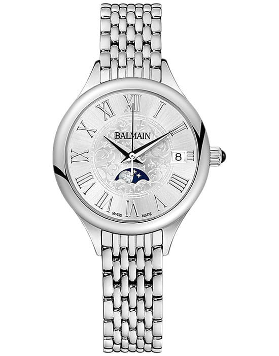 Женские часы Balmain de Balmain B4911.33.12 кварцевый механизм с высокой точностью. Сапфировое стеклоСапфировое стеклоПрочный и надёжный материал из кристалла сапфира синтетического происхождения, характеризующийся особой твёрдостью и устойчивостью к царапинам и повреждениям. устойчивое к появлению царапин, обладающее высокой прозрачностью. Корпус изготовлен из нержавеющей стали. Класс водозащиты: 50 метров, позволит защитить корпус от случайных брызг или капель дождя. Стальной браслет миланского плетения на застёжке «бабочка» с кнопкамиЗастёжка "бабочка"Такой вид застёжки дополняется предохранителями, помогающими избежать случайного раскрытия браслета. Обладают изящным исполнением. . Окошко даты находится в положении 3 часов. Лунный календарь в положении 6 часов.