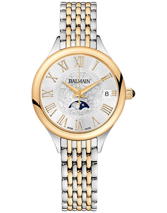 Женские часы Balmain de Balmain B4912.39.12 кварцевый механизм с высокой точностью. Сапфировое стеклоСапфировое стеклоПрочный и надёжный материал из кристалла сапфира синтетического происхождения, характеризующийся особой твёрдостью и устойчивостью к царапинам и повреждениям. устойчивое к появлению царапин, обладающее высокой прозрачностью. Корпус изготовлен из нержавеющей стали. Класс водозащиты: 50 метров, позволит защитить корпус от случайных брызг или капель дождя. Стальной браслет с частичным PVD-покрытиемPVDУльтратонкое покрытие наносится в технике вакуумного напыления, сочетает в себе нитрид титана особой прочности со слоем золота или оксида хрома. Несёт в себе декоративную или защитную функцию.. на застёжке «бабочка» с кнопкамиЗастёжка "бабочка"Такой вид застёжки дополняется предохранителями, помогающими избежать случайного раскрытия браслета. Обладают изящным исполнением. . БезельБезельВнешний ободок, закрепляющий стекло. В спортивных часах так называется поворотное кольцо с делениями на циферблате, выполняет роль таймера – замеряет отрезки времени на шкале. Неподвижный безель – элемент декора. Однонаправленно вращающийся безель на дайверских часах позволяет фиксировать моменты погружения и выныривания на поверхность. с PVD-покрытиемPVDУльтратонкое покрытие наносится в технике вакуумного напыления, сочетает в себе нитрид титана особой прочности со слоем золота или оксида хрома. Несёт в себе декоративную или защитную функцию.. Лунный календарь в позиции 6 часов.