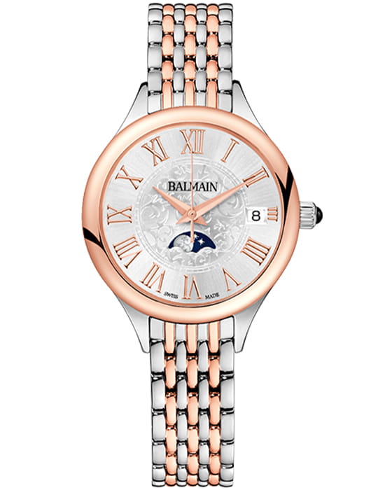 Женские часы Balmain de Balmain B4918.33.12 кварцевый механизм с высокой точностью. Сапфировое стеклоСапфировое стеклоПрочный и надёжный материал из кристалла сапфира синтетического происхождения, характеризующийся особой твёрдостью и устойчивостью к царапинам и повреждениям. устойчивое к появлению царапин, обладающее высокой прозрачностью. Корпус изготовлен из нержавеющей стали. Класс водозащиты: 50 метров, позволит защитить корпус от случайных брызг или капель дождя. Стальной браслет с частичным PVD-покрытиемPVDУльтратонкое покрытие наносится в технике вакуумного напыления, сочетает в себе нитрид титана особой прочности со слоем золота или оксида хрома. Несёт в себе декоративную или защитную функцию.. на застёжке «бабочка» с кнопкамиЗастёжка "бабочка"Такой вид застёжки дополняется предохранителями, помогающими избежать случайного раскрытия браслета. Обладают изящным исполнением. . БезельБезельВнешний ободок, закрепляющий стекло. В спортивных часах так называется поворотное кольцо с делениями на циферблате, выполняет роль таймера – замеряет отрезки времени на шкале. Неподвижный безель – элемент декора. Однонаправленно вращающийся безель на дайверских часах позволяет фиксировать моменты погружения и выныривания на поверхность. с PVD-покрытиемPVDУльтратонкое покрытие наносится в технике вакуумного напыления, сочетает в себе нитрид титана особой прочности со слоем золота или оксида хрома. Несёт в себе декоративную или защитную функцию.. Лунный календарь в позиции 6 часов.