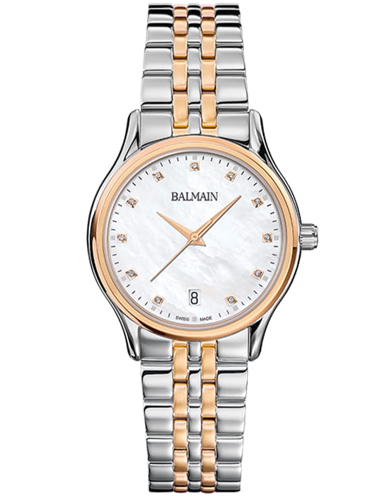 Женские часы Balmain Beleganza B8358.33.86 кварцевый механизм с высокой точностью. Сапфировое стеклоСапфировое стеклоПрочный и надёжный материал из кристалла сапфира синтетического происхождения, характеризующийся особой твёрдостью и устойчивостью к царапинам и повреждениям. устойчивое к появлению царапин, обладающее высокой прозрачностью. Корпус изготовлен из нержавеющей стали. Класс водозащиты: 50 метров, позволит защитить корпус от случайных брызг или капель дождя. Стальной браслет с частичным PVD-покрытиемPVDУльтратонкое покрытие наносится в технике вакуумного напыления, сочетает в себе нитрид титана особой прочности со слоем золота или оксида хрома. Несёт в себе декоративную или защитную функцию.. на застёжке «бабочка» с кнопкамиЗастёжка "бабочка"Такой вид застёжки дополняется предохранителями, помогающими избежать случайного раскрытия браслета. Обладают изящным исполнением. .. БезельБезельВнешний ободок, закрепляющий стекло. В спортивных часах так называется поворотное кольцо с делениями на циферблате, выполняет роль таймера – замеряет отрезки времени на шкале. Неподвижный безель – элемент декора. Однонаправленно вращающийся безель на дайверских часах позволяет фиксировать моменты погружения и выныривания на поверхность. с PVD-покрытиемPVDУльтратонкое покрытие наносится в технике вакуумного напыления, сочетает в себе нитрид титана особой прочности со слоем золота или оксида хрома. Несёт в себе декоративную или защитную функцию.. Окошко даты находится в положении 6 часов.