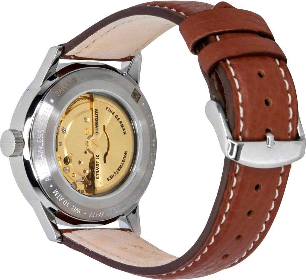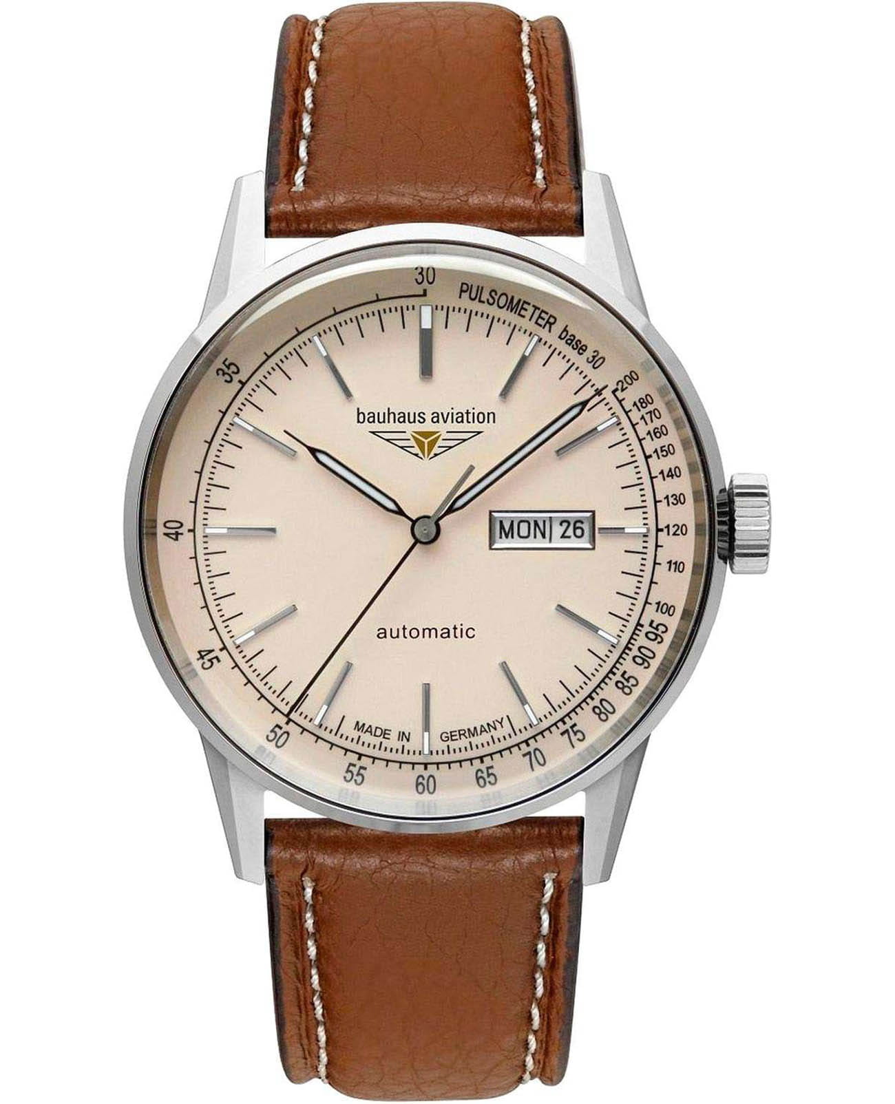 Мужские механические часы с автоподзаводом Bauhaus — это аксессуар в стиле авиационных хронометров. Корпус диаметром 42 мм и толщиной 14 мм выполнен из стали с комбинированной отделкой: матовой и полированной. Циферблат белого цвета выполнен по технологии Sunray («солнечные лучи») и оформлен штрихами и стрелками. Метки и стрелки с люминесцентным покрытиемЛюминесцентное покрытиеПозволяет считывать показания времени в темноте. Производители наносят на стрелки, часовые индексы, безель или поверхность циферблата светонакопительный состав, дающий холодное свечение., обеспечивающим хорошую читаемость в темноте. Окошко даты и дня недели расположено в положении 3 часов. На циферблате присутствует шкала пульсометра, рассчитанная на 30 ударов. Циферблат защищён прочным минеральным стекломМинеральное стеклоМинеральное стекло представляет собой искусственно выращенный минерал кварца. Такое стекло отличается особой устойчивостью к повреждениям и царапинам. Уступает по некоторым качествам сапфировому стеклу. K1. Механизм — автоматический калибр Miyota 8205 (21 камень, частота 21 600 полуколебаний в час) с запасом хода до 42 часов. Рифлёная заводная головка украшена фирменным логотипом. Прозрачная задняя крышка позволяет наблюдать за работой механизма. Часы оснащены кожаным ремешком с декоративной белой строчкой и классической пряжкой. Водонепроницаемость 100 м позволяет использовать часы для плавания и повседневного ношения. Идеальный выбор для тех, кто ценит немецкое качество и функциональный дизайн.