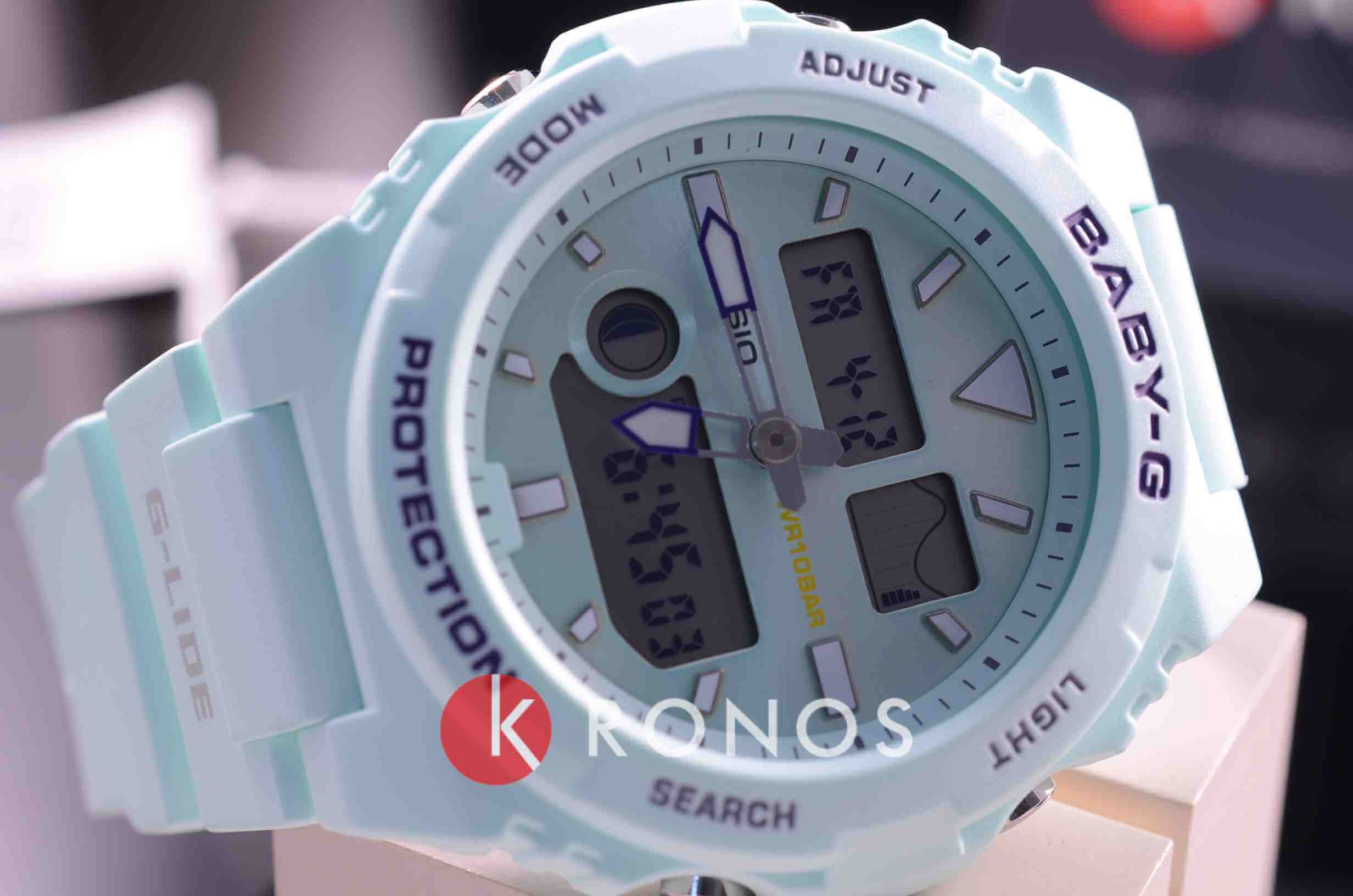 Женские японские часы Casio Baby-G G-Lide BAX-100-3AER c хронографомХронографФункция позволяет измерять отрезки времени с особой точностью: часы, минуты, секунды. Верным признаком хронографа является наличие на циферблате 3 дополнительных окошек-счётчиков. из коллекции Baby-G выпущены специально для любительниц сёрфинга и больших волн.