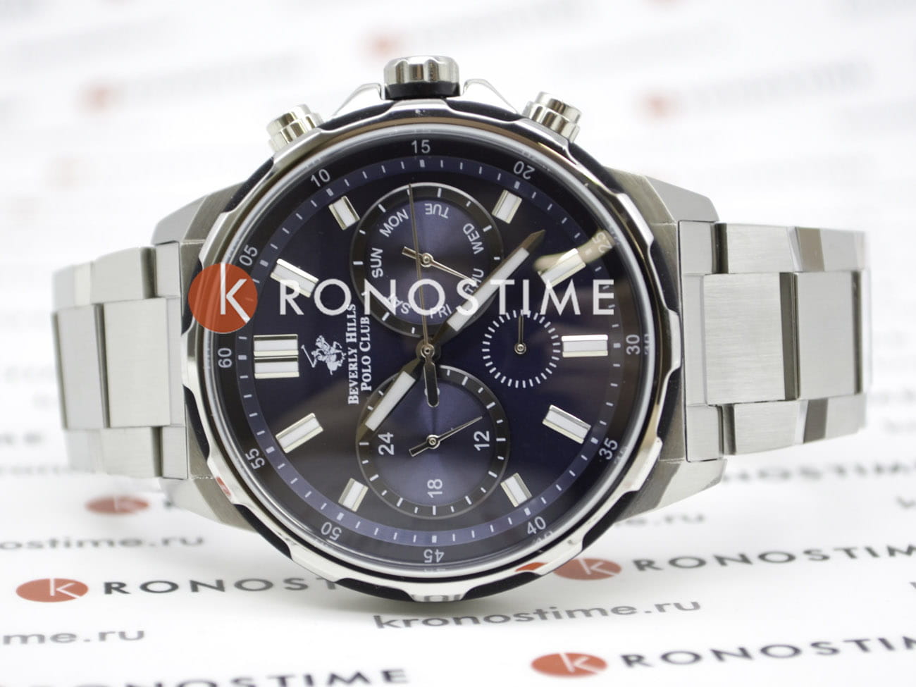 Американские мужские часы Beverly Hills Polo Club BP3403X.390 с минеральным стекломМинеральное стеклоМинеральное стекло представляет собой искусственно выращенный минерал кварца. Такое стекло отличается особой устойчивостью к повреждениям и царапинам. Уступает по некоторым качествам сапфировому стеклу., кварцевый механизм с высокой точностью. Корпус и браслет часов изготовлены из нержавеющей стали. Неподвижный безельБезельВнешний ободок, закрепляющий стекло. В спортивных часах так называется поворотное кольцо с делениями на циферблате, выполняет роль таймера – замеряет отрезки времени на шкале. Неподвижный безель – элемент декора. Однонаправленно вращающийся безель на дайверских часах позволяет фиксировать моменты погружения и выныривания на поверхность. из нержавеющей стали с частичным IP-покрытиемIP-покрытиеМетод ионного напыления. Демонстрирует повышенную устойчивость к истиранию, окислению и химическим веществам. Под воздействием высокого давления и температуры около 1500°C молекулы металла надёжно соединяются с частицами корпуса часов.. Стрелки с люминесцентной подсветкойЛюминесцентное покрытиеПозволяет считывать показания времени в темноте. Производители наносят на стрелки, часовые индексы, безель или поверхность циферблата светонакопительный состав, дающий холодное свечение.. На циферблате расположены три дополнительных индикатора и окошко даты. Класс водозащиты: 100 метров, позволит плавать, нырять и заниматься другими водными видами спорта. Стальной браслет на раскладной застёжкеРаскладная застёжкаТакой тип застёжки используется только на браслетах из металла. Она никогда не раскрывается полностью, происходит разделение на 2 и более частей. Раскладывающая застёжка снизит вероятность потери часов к минимуму..