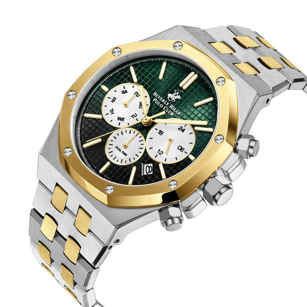 Beverly Hills Polo Club BP3051X.270 — выразительная модель с подчёркнуто мужским характером, в элегантном золотистом оттенке и строгих геометриях корпуса. Корпус диаметром около 42 мм из нержавеющей стали безельБезельВнешний ободок, закрепляющий стекло. В спортивных часах так называется поворотное кольцо с делениями на циферблате, выполняет роль таймера – замеряет отрезки времени на шкале. Неподвижный безель – элемент декора. Однонаправленно вращающийся безель на дайверских часах позволяет фиксировать моменты погружения и выныривания на поверхность. с IP-покрытияIP-покрытиеМетод ионного напыления. Демонстрирует повышенную устойчивость к истиранию, окислению и химическим веществам. Под воздействием высокого давления и температуры около 1500°C молекулы металла надёжно соединяются с частицами корпуса часов. оформлен в современной октагональной форме, вызывая ассоциации с принципиальным архитектурным стилем.