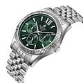 Циферблат оформлен с изысканной симметрией: три отдельных индикатора отображают день недели, дату и 24-часовой формат. Арабские цифры и декоративные акценты придают дизайну лёгкость и выразительность. Стрелки и метки обеспечивают удобное считывание показаний в течение дня.