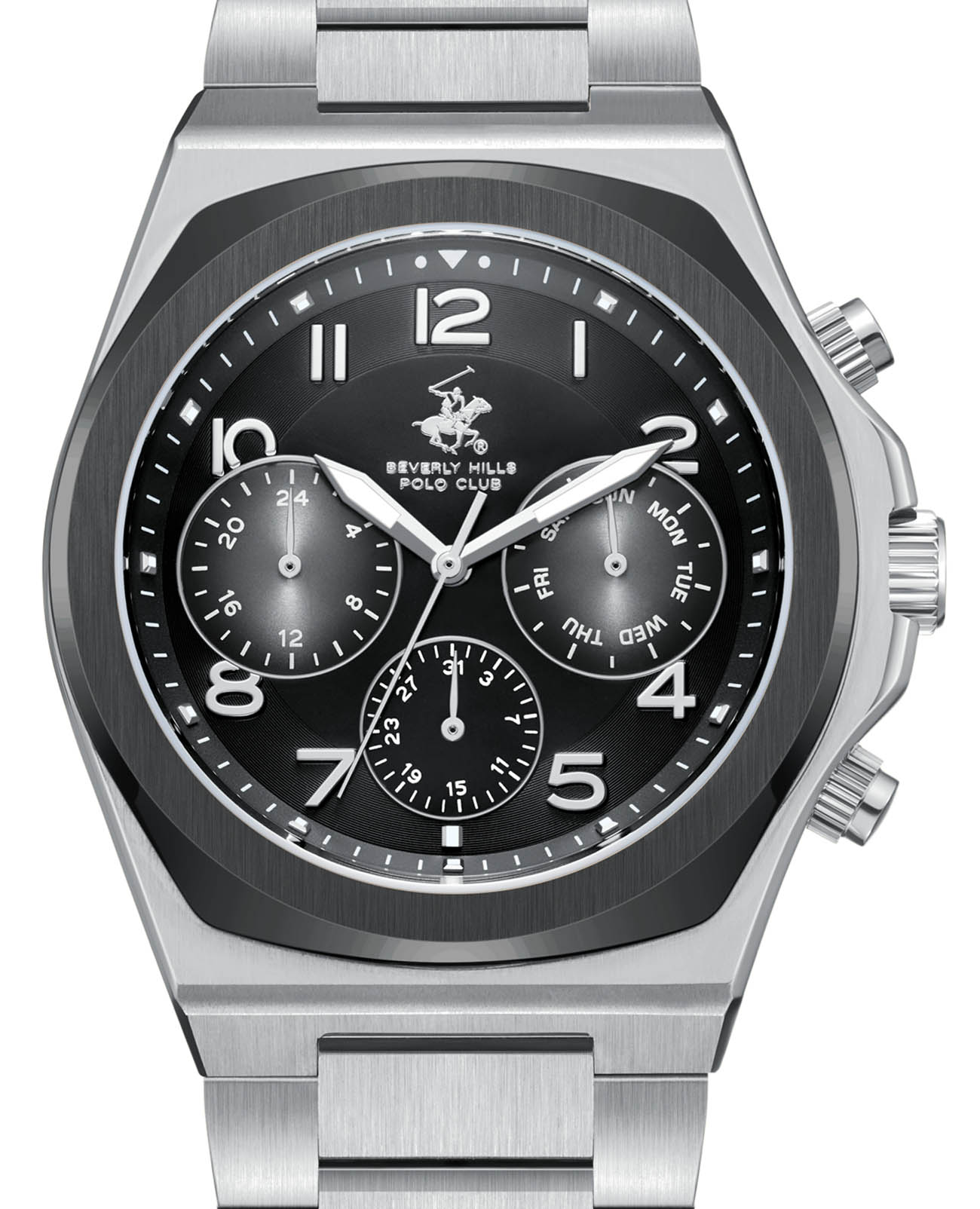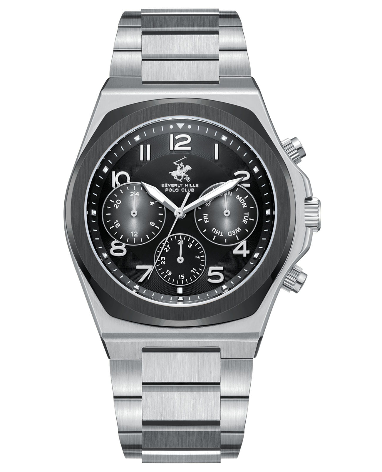 Мужские кварцевые часы Beverly Hills Polo Club BP3777X.350 — это стильный аксессуар, сочетающий в себе элегантность и надёжность. Модель выполнена из стали, безель с IP-покрытиемIP-покрытиеМетод ионного напыления. Демонстрирует повышенную устойчивость к истиранию, окислению и химическим веществам. Под воздействием высокого давления и температуры около 1500°C молекулы металла надёжно соединяются с частицами корпуса часов. чёрного цвета, что придаёт ей благородный внешний вид и устойчивость к царапинам. Корпус диаметром 42 мм защищён сапфировым стекломСапфировое стеклоПрочный и надёжный материал из кристалла сапфира синтетического происхождения, характеризующийся особой твёрдостью и устойчивостью к царапинам и повреждениям., устойчивым к повреждениям и обеспечивающим чёткую видимость циферблата. Циферблат чёрного цвета дополнен метками в виде штрихов и индикацией даты, дня недели и 24-часового формата, что делает его удобным для повседневного использования. Стальной браслет оснащён классической застёжкой, обеспечивая комфорт и надёжную фиксацию на запястье. Водонепроницаемость позволяет использовать модель в повседневных условиях — при мытье рук или под лёгким дождём. Эти часы станут универсальным аксессуаром для тех, кто ценит сочетание стиля, функциональности и качества — идеальный выбор для повседневной носки и деловых встреч.
