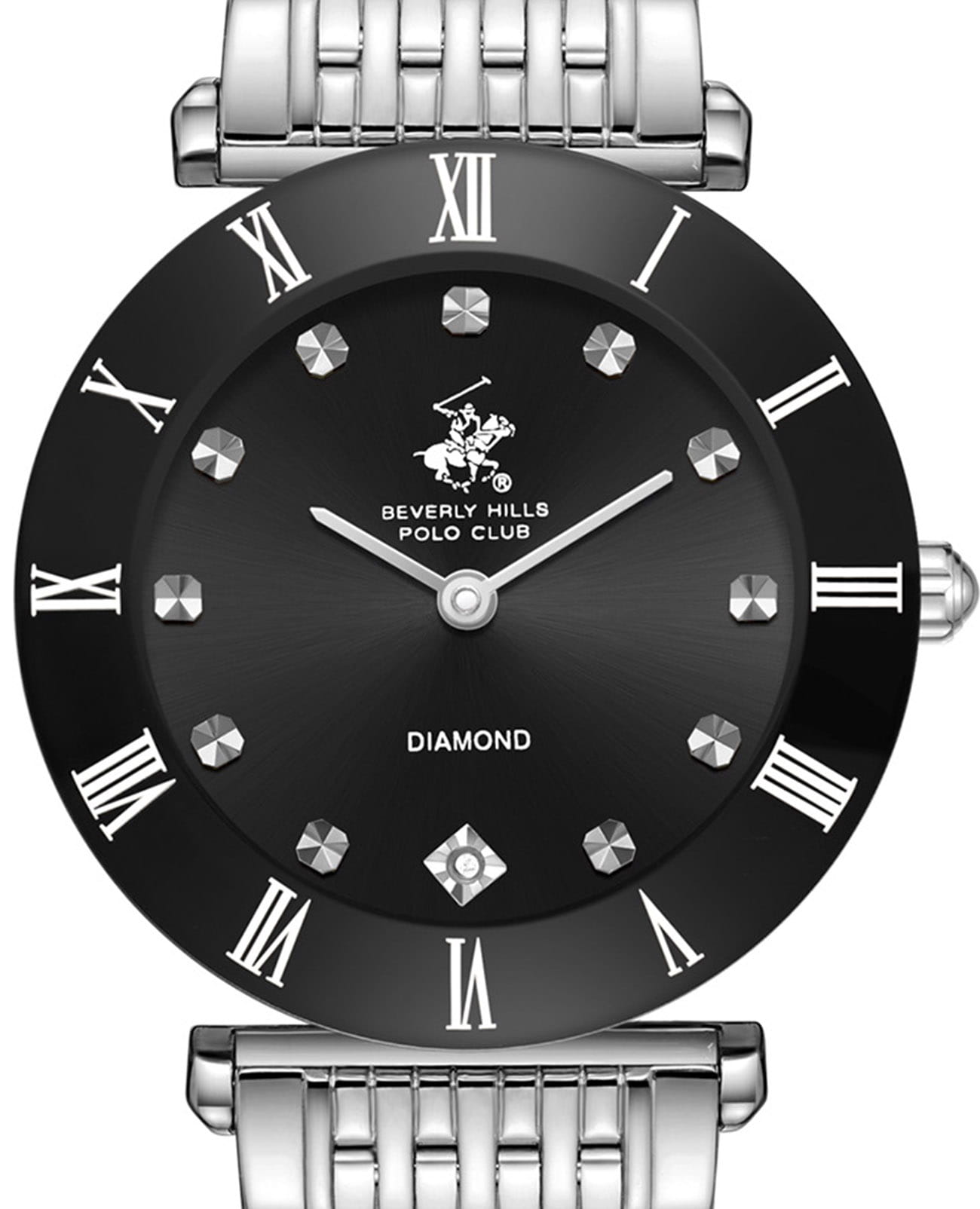 Женские кварцевые часы Beverly Hills Polo Club — это символ элегантного стиля и безупречного вкуса. Корпус диаметром 30 мм выполнен из суперметалла. БезельБезельВнешний ободок, закрепляющий стекло. В спортивных часах так называется поворотное кольцо с делениями на циферблате, выполняет роль таймера – замеряет отрезки времени на шкале. Неподвижный безель – элемент декора. Однонаправленно вращающийся безель на дайверских часах позволяет фиксировать моменты погружения и выныривания на поверхность. из суперметалла с IP-покрытиемIP-покрытиеМетод ионного напыления. Демонстрирует повышенную устойчивость к истиранию, окислению и химическим веществам. Под воздействием высокого давления и температуры около 1500°C молекулы металла надёжно соединяются с частицами корпуса часов.. Циферблат чёрного цвета оформлен римскими цифрами, стрелками и инкрустирован одним синтетическим бриллиантом. Циферблат защищён минеральным стекломМинеральное стеклоМинеральное стекло представляет собой искусственно выращенный минерал кварца. Такое стекло отличается особой устойчивостью к повреждениям и царапинам. Уступает по некоторым качествам сапфировому стеклу. с сапфировым покрытием. Часы оснащены стальным браслетом на застёжке «бабочка» с кнопкамиЗастёжка "бабочка"Такой вид застёжки дополняется предохранителями, помогающими избежать случайного раскрытия браслета. Обладают изящным исполнением. . Водонепроницаемость 30 м позволяет использовать часы в повседневных условиях. Идеальный выбор для тех, кто ценит американское качество и универсальный дизайн.
