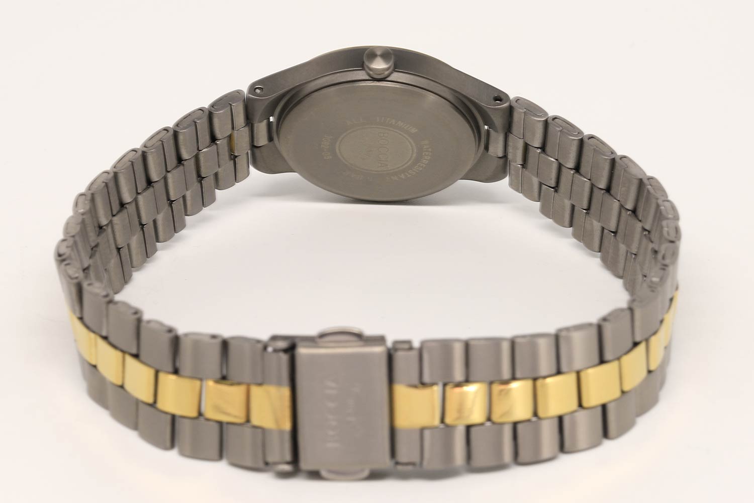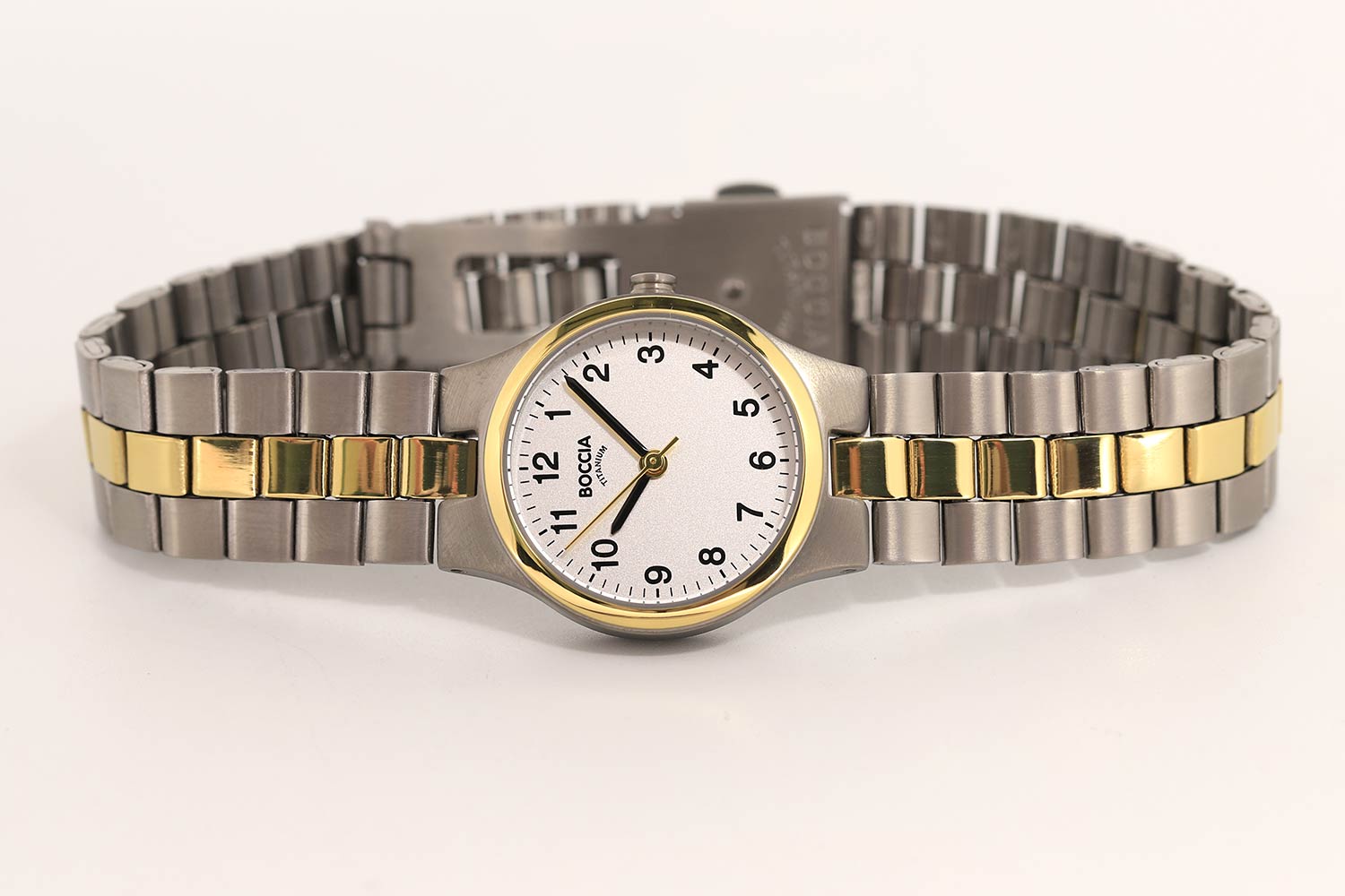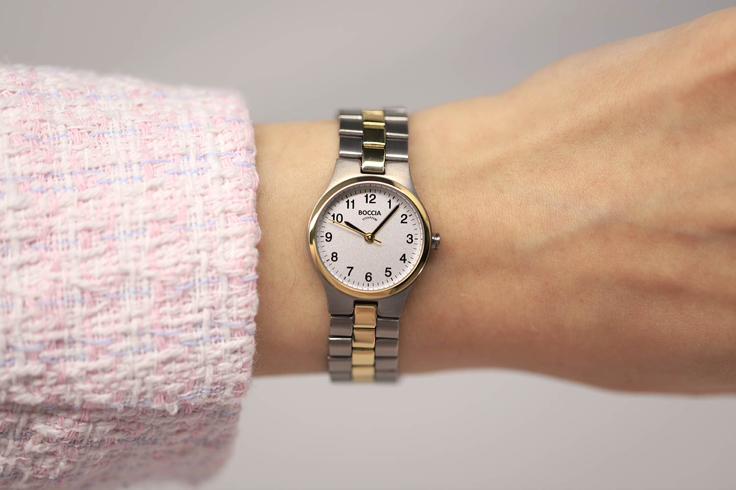 Женские наручные часы Boccia Titanium 3082-05 с надёжным кварцевым механизмом. Корпус часов изготовлен из титана. Титановый браслет с частичным PVD-покрытиемPVDУльтратонкое покрытие наносится в технике вакуумного напыления, сочетает в себе нитрид титана особой прочности со слоем золота или оксида хрома. Несёт в себе декоративную или защитную функцию. на раскладной застёжкеРаскладная застёжкаТакой тип застёжки используется только на браслетах из металла. Она никогда не раскрывается полностью, происходит разделение на 2 и более частей. Раскладывающая застёжка снизит вероятность потери часов к минимуму.. Минеральное стеклоМинеральное стеклоМинеральное стекло представляет собой искусственно выращенный минерал кварца. Такое стекло отличается особой устойчивостью к повреждениям и царапинам. Уступает по некоторым качествам сапфировому стеклу. устойчивое к мелким механическим повреждениям. Класс водозащиты: 50 метров, позволит защитить корпус от случайных брызг или капель дождя.