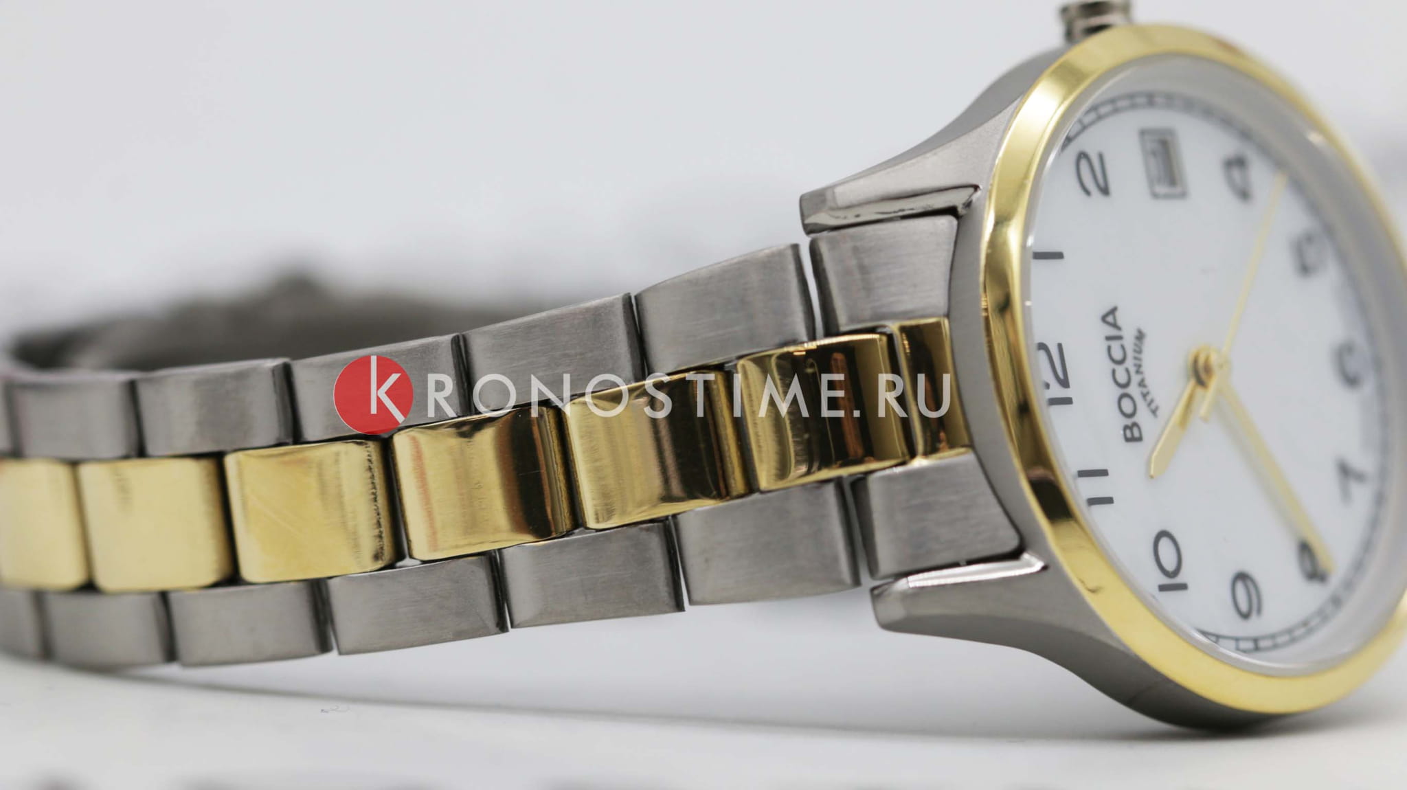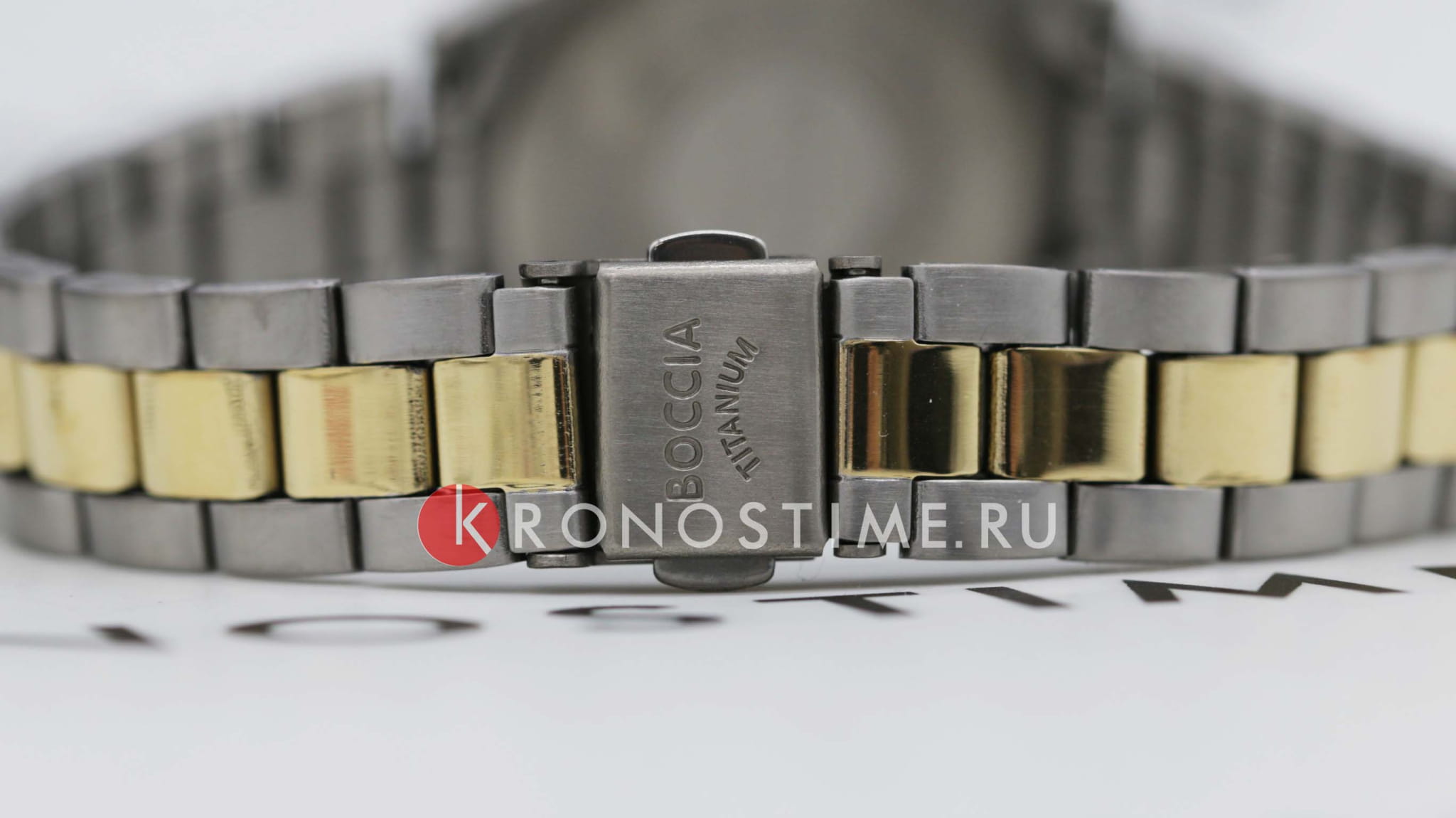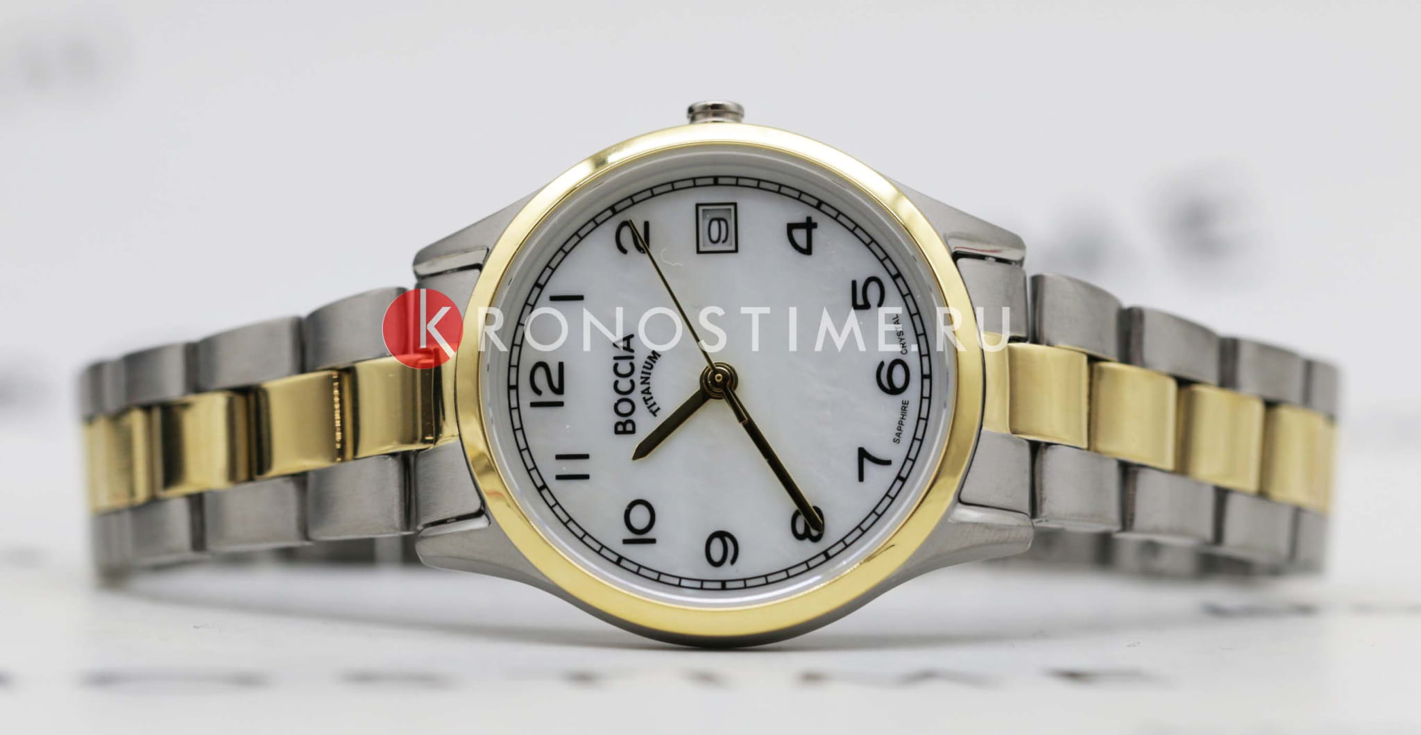 Женские наручные часы Boccia Titanium 3324-02 с надёжным кварцевым механизмом. Корпус и браслет часов изготовлены из титана. Сапфировое стеклоСапфировое стеклоПрочный и надёжный материал из кристалла сапфира синтетического происхождения, характеризующийся особой твёрдостью и устойчивостью к царапинам и повреждениям. устойчивое к мелким механическим повреждениям. Класс водозащиты: 50 метров, позволит защитить корпус от случайных брызг или капель дождя. Титановый браслет с частичным PVD-покрытиемPVDУльтратонкое покрытие наносится в технике вакуумного напыления, сочетает в себе нитрид титана особой прочности со слоем золота или оксида хрома. Несёт в себе декоративную или защитную функцию. на раскладной застёжкеРаскладная застёжкаТакой тип застёжки используется только на браслетах из металла. Она никогда не раскрывается полностью, происходит разделение на 2 и более частей. Раскладывающая застёжка снизит вероятность потери часов к минимуму.. Окошко даты находится в положении 3 часа.