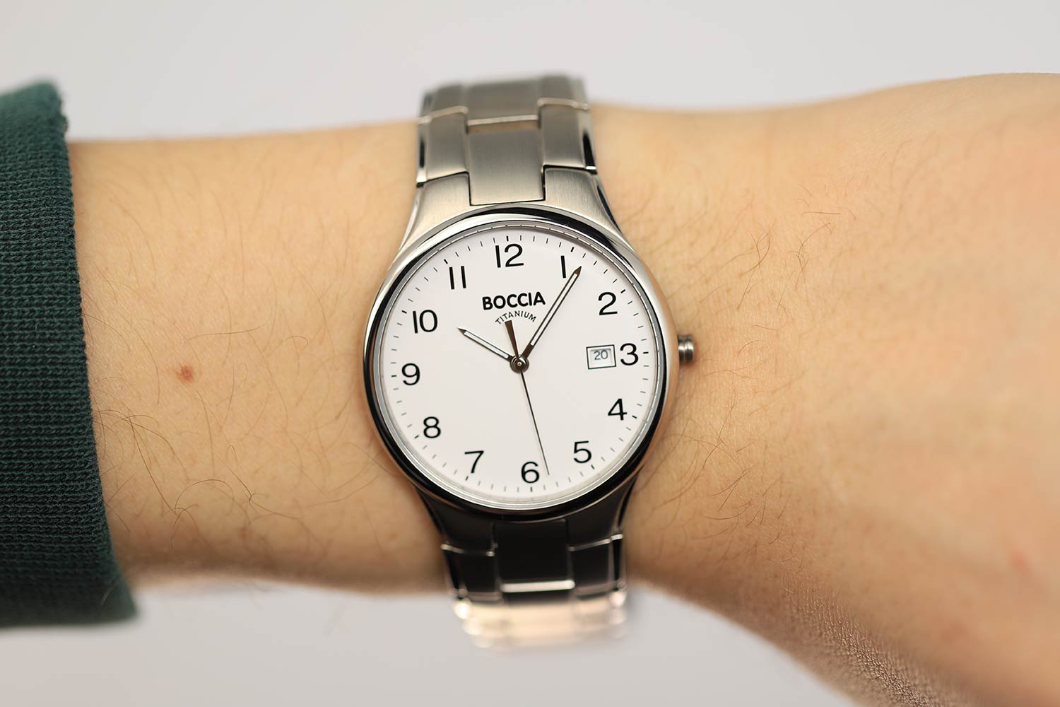 Мужские немецкие титановые часы Boccia Titanium Circle-Oval 3512-08, кварцевый механизм с высокой точностью. Минеральное стеклоМинеральное стеклоМинеральное стекло представляет собой искусственно выращенный минерал кварца. Такое стекло отличается особой устойчивостью к повреждениям и царапинам. Уступает по некоторым качествам сапфировому стеклу. устойчивое к появлению царапин, обладающее высокой прозрачностью. Корпус изготовлен из титана. Стрелки с люминесцентным покрытиемЛюминесцентное покрытиеПозволяет считывать показания времени в темноте. Производители наносят на стрелки, часовые индексы, безель или поверхность циферблата светонакопительный состав, дающий холодное свечение.. Окошко даты в положении 3 часов. Класс водозащиты: 50 метров, позволит защитить корпус от случайных брызг или капель дождя. Браслет из титана на раскладной застёжкеРаскладная застёжкаТакой тип застёжки используется только на браслетах из металла. Она никогда не раскрывается полностью, происходит разделение на 2 и более частей. Раскладывающая застёжка снизит вероятность потери часов к минимуму..