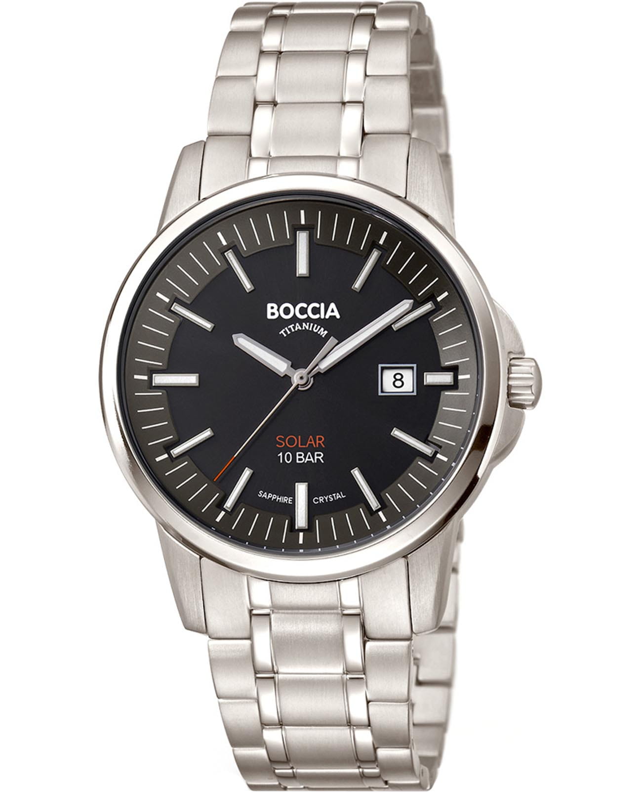 Мужские наручные часы Boccia Titanium 3643-04 с надёжным кварцевым механизмом. Питание от солнечной энергии. Корпус и браслет часов изготовлены из титана. Сапфировое стеклоСапфировое стеклоПрочный и надёжный материал из кристалла сапфира синтетического происхождения, характеризующийся особой твёрдостью и устойчивостью к царапинам и повреждениям. устойчивое к мелким механическим повреждениям. Класс водозащиты: 100 метров, позволит плавать, нырять и заниматься другими водными видами спорта. Окошко даты в положении 3 часа. Титановый браслет на раскладной застёжкеРаскладная застёжкаТакой тип застёжки используется только на браслетах из металла. Она никогда не раскрывается полностью, происходит разделение на 2 и более частей. Раскладывающая застёжка снизит вероятность потери часов к минимуму.. Стрелки и метки с люминесцентным покрытиемЛюминесцентное покрытиеПозволяет считывать показания времени в темноте. Производители наносят на стрелки, часовые индексы, безель или поверхность циферблата светонакопительный состав, дающий холодное свечение..