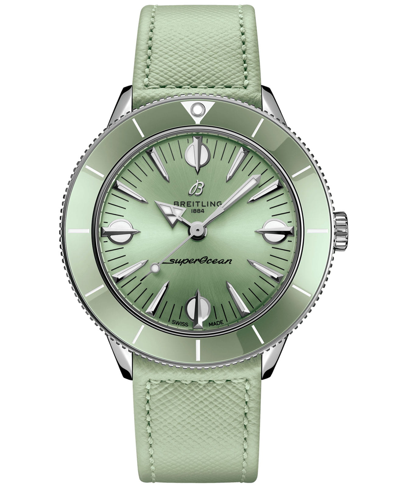 Красочная дань уважения часовой компании Breitling оригинальной модели SuperOcean и воплощение пляжного стиля. В капсульной коллекции Superocean Heritage ’57 Pastel Paradise использованы некоторые элементы дизайна первой модели SuperOcean 1957 года выпуска, такие как вогнутый керамический безель, крупные индексы и часовая стрелка в форме стрелы.