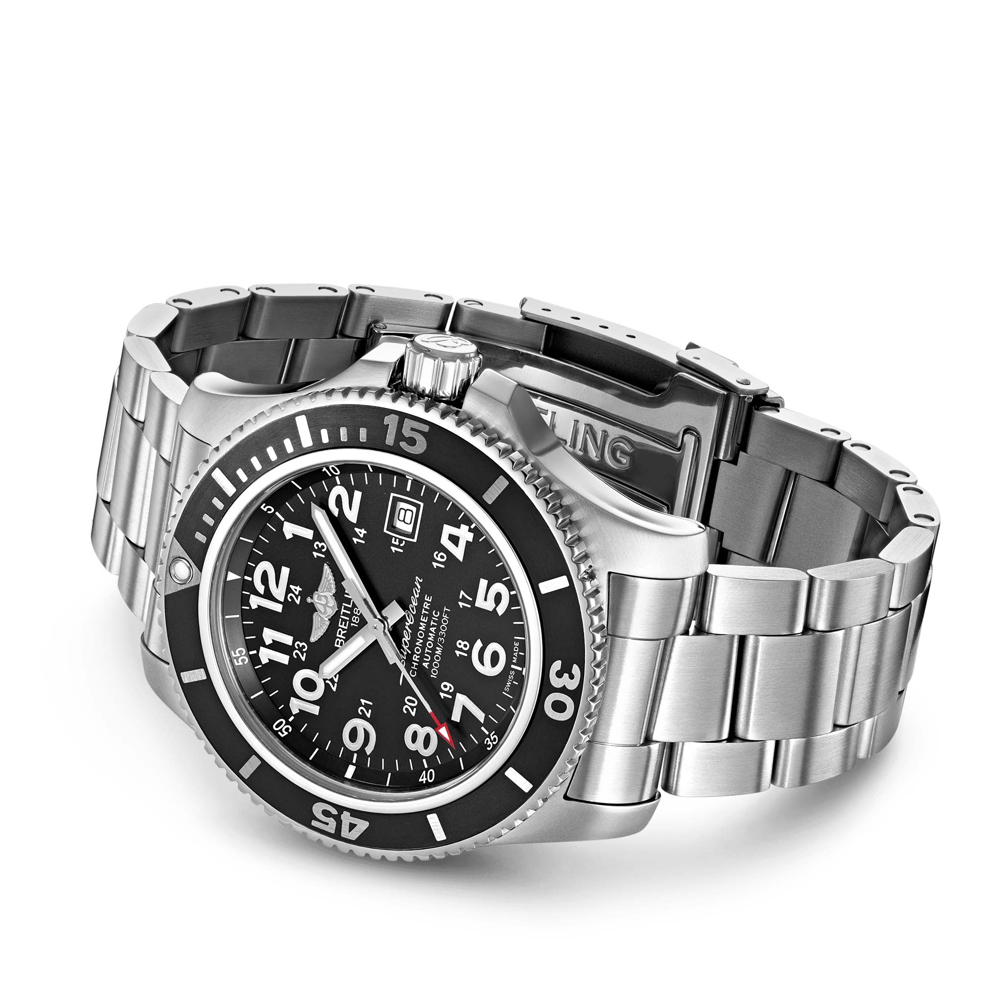 Мужские водонепроницаемые швейцарские часы Breitling Superocean II 44 A17392D71B1A1, механический механизм (автоматический калибр) с высокой точностью. Сапфировое стеклоСапфировое стеклоПрочный и надёжный материал из кристалла сапфира синтетического происхождения, характеризующийся особой твёрдостью и устойчивостью к царапинам и повреждениям. устойчивое к появлению царапин, обладающее высокой прозрачностью. Класс водозащиты: 1000 метров, позволит плавать, нырять и заниматься другими водными видами спорта. Корпус часов изготовлен из нержавеющей стали. Стальной браслет на раскладной застёжкеРаскладная застёжкаТакой тип застёжки используется только на браслетах из металла. Она никогда не раскрывается полностью, происходит разделение на 2 и более частей. Раскладывающая застёжка снизит вероятность потери часов к минимуму.. Стрелки и метки с люминесцентным покрытиемЛюминесцентное покрытиеПозволяет считывать показания времени в темноте. Производители наносят на стрелки, часовые индексы, безель или поверхность циферблата светонакопительный состав, дающий холодное свечение.. Широкие стрелки и индексы с люминесцентным покрытиемЛюминесцентное покрытиеПозволяет считывать показания времени в темноте. Производители наносят на стрелки, часовые индексы, безель или поверхность циферблата светонакопительный состав, дающий холодное свечение. обеспечивают легкую читаемость под водой. Поворотный безельБезельВнешний ободок, закрепляющий стекло. В спортивных часах так называется поворотное кольцо с делениями на циферблате, выполняет роль таймера – замеряет отрезки времени на шкале. Неподвижный безель – элемент декора. Однонаправленно вращающийся безель на дайверских часах позволяет фиксировать моменты погружения и выныривания на поверхность. из стали с керамической инкрустацией, защищенный от царапин, никогда не изнашивается и не выцветает.