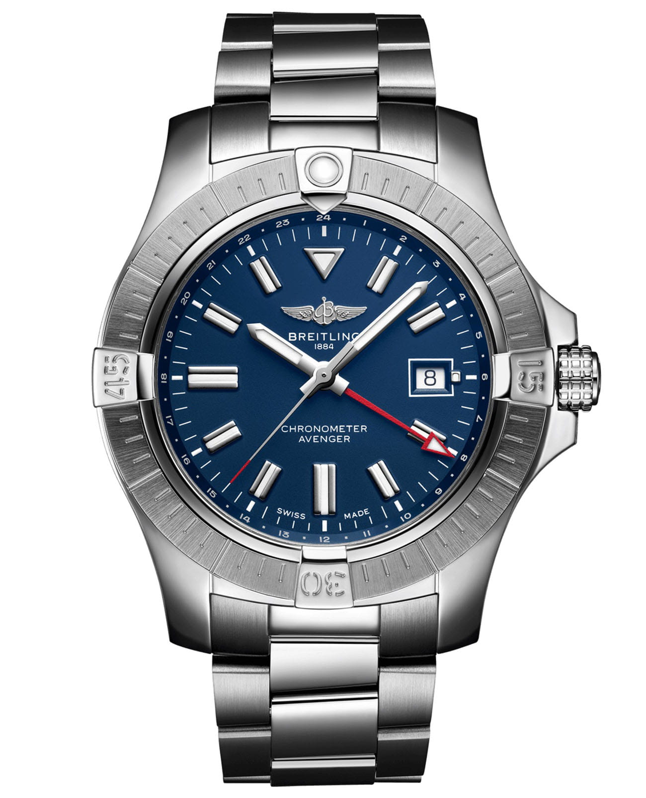 Мужские швейцарские часы Breitling Avenger Automatic GMT 45 A32395101C1A1, механический механизм (автоматический калибр) Breitling 32 с высокой точностью. Выпуклое сапфировое стекло устойчивое к появлению царапин, обладающее высокой прозрачностью и антибликовым покрытием с обеих сторон.