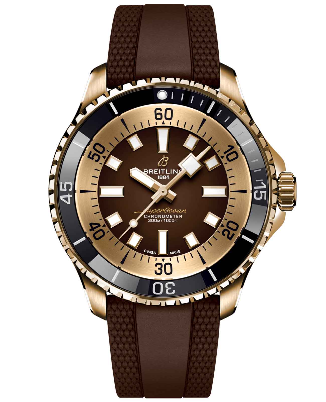 Мужские водонепроницаемые швейцарские часы Breitling Superocean Automatic 44 N17376201Q1S1, механический механизм (автоматический калибр) с высокой точностью. Сапфировое стеклоСапфировое стеклоПрочный и надёжный материал из кристалла сапфира синтетического происхождения, характеризующийся особой твёрдостью и устойчивостью к царапинам и повреждениям. устойчивое к появлению царапин, обладающее высокой прозрачностью. Класс водозащиты: 300 метров, позволит плавать, нырять и заниматься другими водными видами спорта. Корпус часов изготовлен из бронзы. В бронзовой версии используется специальный сплав, который обладает превосходной устойчивостью к коррозии, но со временем все равно образует тонкую патину, что делает часы еще более уникальными. Силиконовый ремешок с раскладной застёжкойРаскладная застёжкаТакой тип застёжки используется только на браслетах из металла. Она никогда не раскрывается полностью, происходит разделение на 2 и более частей. Раскладывающая застёжка снизит вероятность потери часов к минимуму.. Вращающийся безельБезельВнешний ободок, закрепляющий стекло. В спортивных часах так называется поворотное кольцо с делениями на циферблате, выполняет роль таймера – замеряет отрезки времени на шкале. Неподвижный безель – элемент декора. Однонаправленно вращающийся безель на дайверских часах позволяет фиксировать моменты погружения и выныривания на поверхность. из нержавеющей стали и керамики с люминесцентным покрытиемЛюминесцентное покрытиеПозволяет считывать показания времени в темноте. Производители наносят на стрелки, часовые индексы, безель или поверхность циферблата светонакопительный состав, дающий холодное свечение. Superluminova. Лучше всего то, что это больше не просто часы для дайвинга — занимайтесь с ними серфингом, плавайте с ними, заходите с ними в пляжный бар, а затем надевайте их на ужин. Superocean идеально сочетает ностальгию по своему наследию со свежим внешним видом.