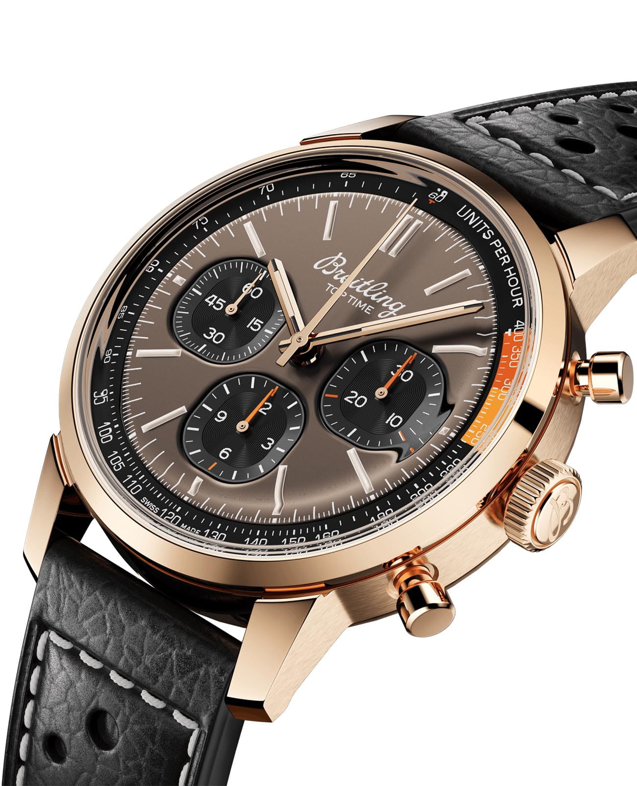 Мужские швейцарские часы-хронографХронографФункция позволяет измерять отрезки времени с особой точностью: часы, минуты, секунды. Верным признаком хронографа является наличие на циферблате 3 дополнительных окошек-счётчиков. с тахиметромТахиметрРазмеченная шкала, располагается на ободке или безеле часов. Тахиметр позволяет рассчитать скорость на определённом участке пути, расстояние измеряется в километрах или милях. Breitling Top Time B01 RB01761A1Q1X1, механический механизм (автоматический калибр) с высокой точностью. Сапфировое стеклоСапфировое стеклоПрочный и надёжный материал из кристалла сапфира синтетического происхождения, характеризующийся особой твёрдостью и устойчивостью к царапинам и повреждениям. устойчивое к появлению царапин, обладающее высокой прозрачностью. Корпус часов изготовлен из красного 18-каратного золота18-каратное золотоОбозначение по каратной системе пробирования, оно показывает, сколько драгоценного металла содержится в изделии. 18 карат - в составе 75% чистого золота, соответствует 750 пробе.