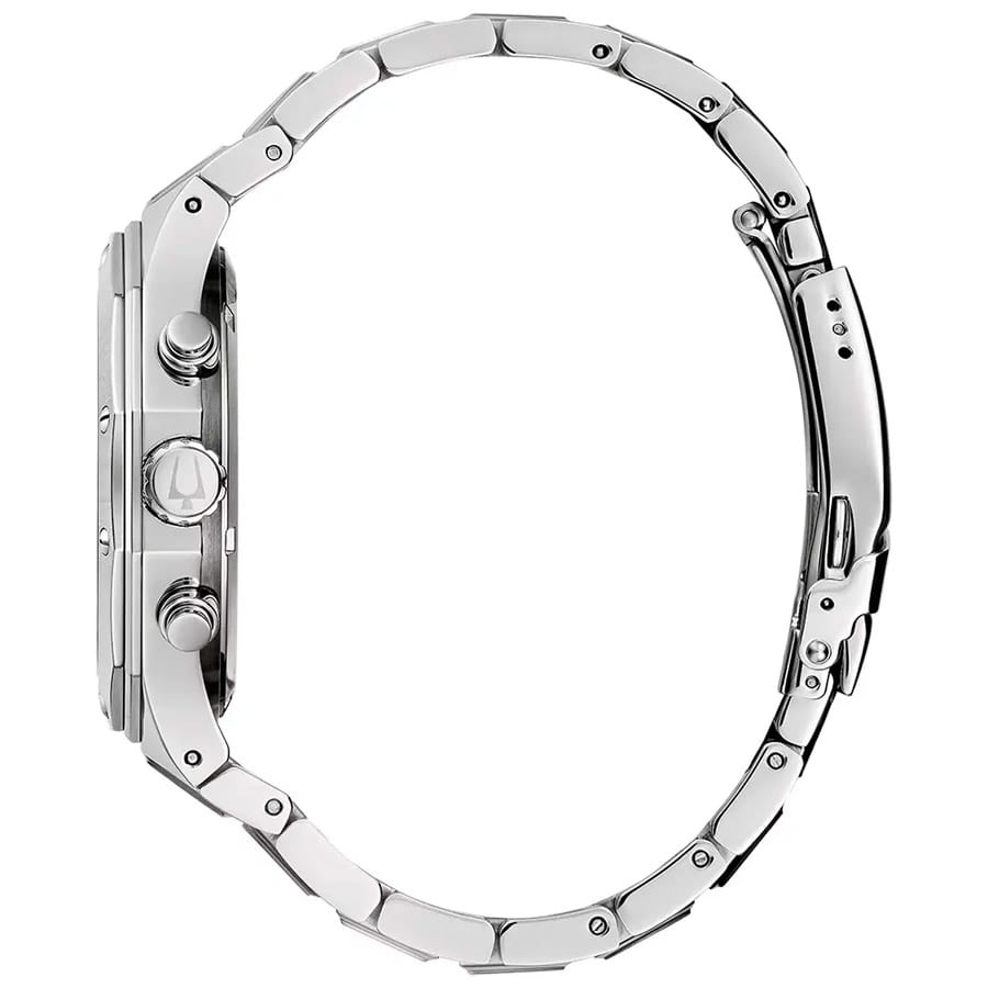 Мужские кварцевые часы-хронографХронографФункция позволяет измерять отрезки времени с особой точностью: часы, минуты, секунды. Верным признаком хронографа является наличие на циферблате 3 дополнительных окошек-счётчиков. Bulova Classic 96B409 – отражающий идеальное сочетание современного дизайна, надёжности и функциональности. Элегантный облик станет превосходным завершением образа, наделив его индивидуальным характером. Корпус из нержавеющей стали, диаметром 44 мм идеально сбалансирован и элегантен. Минеральное стеклоМинеральное стеклоМинеральное стекло представляет собой искусственно выращенный минерал кварца. Такое стекло отличается особой устойчивостью к повреждениям и царапинам. Уступает по некоторым качествам сапфировому стеклу. защищает циферблат от царапин и устойчивое к мелким механическим повреждениям. Шкала тахиметраТахиметрРазмеченная шкала, располагается на ободке или безеле часов. Тахиметр позволяет рассчитать скорость на определённом участке пути, расстояние измеряется в километрах или милях. на циферблате. Стальной браслет на раскладной застёжкеРаскладная застёжкаТакой тип застёжки используется только на браслетах из металла. Она никогда не раскрывается полностью, происходит разделение на 2 и более частей. Раскладывающая застёжка снизит вероятность потери часов к минимуму. обеспечивает комфортное ношение. Стрелки и метки с люминесцентным покрытиемЛюминесцентное покрытиеПозволяет считывать показания времени в темноте. Производители наносят на стрелки, часовые индексы, безель или поверхность циферблата светонакопительный состав, дающий холодное свечение. позволяющие легко определять время даже в темноте. Водозащита 100 метров, позволит плавать, нырять и заниматься другими водными видами спорта. Окошко даты находится в положении между 4 и 5 часов. Эта модель – отличный выбор для тех, кто ищет сочетание стиля, качества и функциональности. Часы станут не только полезным аксессуаром, но и выразительным элементом вашего имиджа.