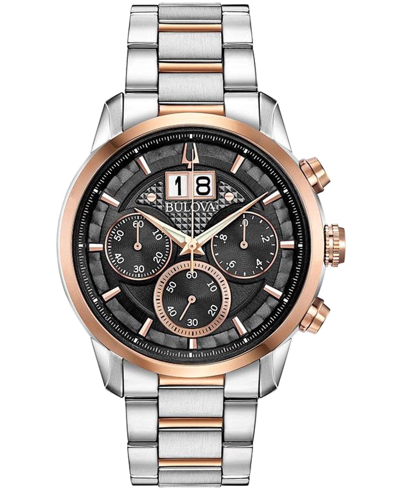 Мужские кварцевые часы-хронографХронографФункция позволяет измерять отрезки времени с особой точностью: часы, минуты, секунды. Верным признаком хронографа является наличие на циферблате 3 дополнительных окошек-счётчиков. Bulova Sutton 98B335 – отражающий идеальное сочетание современного дизайна, надёжности и функциональности. Элегантный облик станет превосходным завершением образа, наделив его индивидуальным характером. Корпус из нержавеющей стали серебристого цвета, диаметром 44 мм идеально сбалансирован и элегантен. Минеральное стеклоМинеральное стеклоМинеральное стекло представляет собой искусственно выращенный минерал кварца. Такое стекло отличается особой устойчивостью к повреждениям и царапинам. Уступает по некоторым качествам сапфировому стеклу. защищает циферблат от царапин и устойчивое к мелким механическим повреждениям. Малые циферблат на 60 секунд, 60 минут, 10 часов. Большая дата в позиции 12 часов. Стальной браслет с частичным IP-покрытиемIP-покрытиеМетод ионного напыления. Демонстрирует повышенную устойчивость к истиранию, окислению и химическим веществам. Под воздействием высокого давления и температуры около 1500°C молекулы металла надёжно соединяются с частицами корпуса часов. на застёжке-бабочке с кнопкамиЗастёжка "бабочка"Такой вид застёжки дополняется предохранителями, помогающими избежать случайного раскрытия браслета. Обладают изящным исполнением. обеспечивает комфортное ношение. Неподвижный безельБезельВнешний ободок, закрепляющий стекло. В спортивных часах так называется поворотное кольцо с делениями на циферблате, выполняет роль таймера – замеряет отрезки времени на шкале. Неподвижный безель – элемент декора. Однонаправленно вращающийся безель на дайверских часах позволяет фиксировать моменты погружения и выныривания на поверхность. с IP-покрытиемIP-покрытиеМетод ионного напыления. Демонстрирует повышенную устойчивость к истиранию, окислению и химическим веществам. Под воздействием высокого давления и температуры около 1500°C молекулы металла надёжно соединяются с частицами корпуса часов.. Водозащита 30 метров позволит защитить корпус от случайных брызг или капель дождя. Стрелки с люминесцентным покрытиемЛюминесцентное покрытиеПозволяет считывать показания времени в темноте. Производители наносят на стрелки, часовые индексы, безель или поверхность циферблата светонакопительный состав, дающий холодное свечение. позволяющие легко определять время даже в темноте. Эта модель – отличный выбор для тех, кто ищет сочетание стиля, качества и функциональности. Часы станут не только полезным аксессуаром, но и выразительным элементом вашего имиджа.