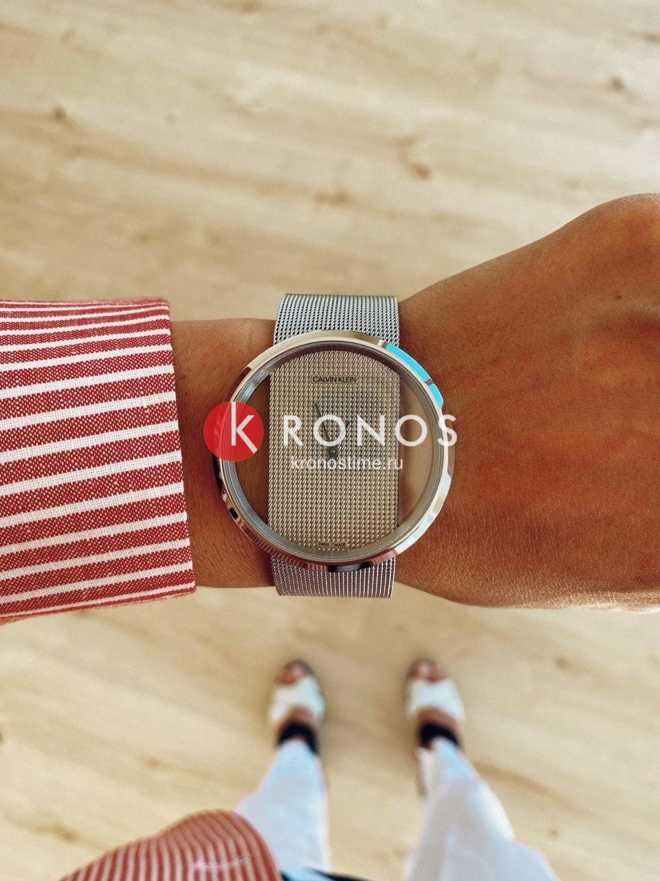 Полупрозрачный корпус имеет циферблат с тиснёным узором, визуально перетекающим в браслет миланского плетения. Оригинальная модель работает за счёт швейцарского кварцевого механизма ETA F03.111. Сапфировое стекло устойчиво к царапинам.