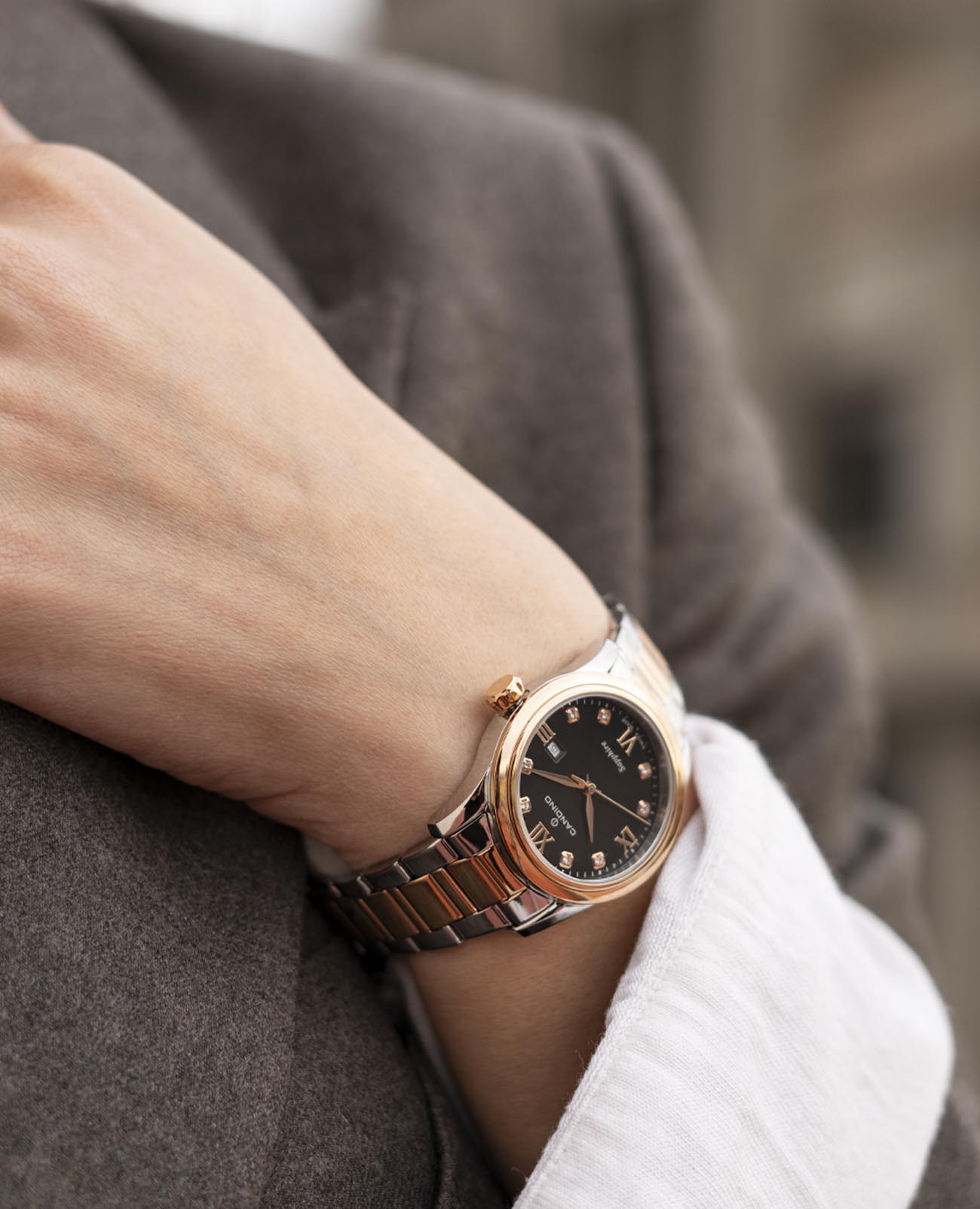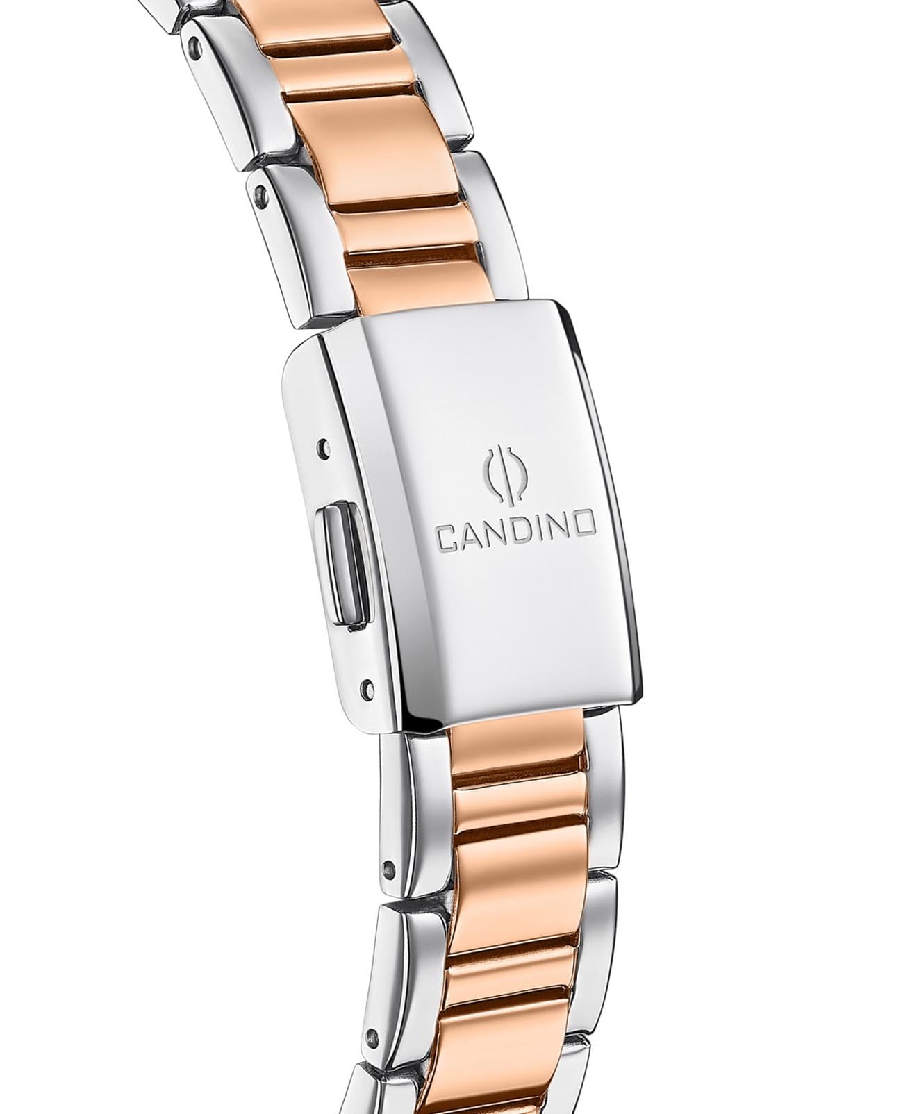 Женские швейцарские часы Candino Elegance C4739/5 с надёжным кварцевым механизмом. Корпус часов изготовлен из нержавеющей стали. Сапфировое стеклоСапфировое стеклоПрочный и надёжный материал из кристалла сапфира синтетического происхождения, характеризующийся особой твёрдостью и устойчивостью к царапинам и повреждениям. устойчивое к мелким механическим повреждениям. Стальной браслет с частичным PVD-покрытиемPVDУльтратонкое покрытие наносится в технике вакуумного напыления, сочетает в себе нитрид титана особой прочности со слоем золота или оксида хрома. Несёт в себе декоративную или защитную функцию. на раскладной застёжкеРаскладная застёжкаТакой тип застёжки используется только на браслетах из металла. Она никогда не раскрывается полностью, происходит разделение на 2 и более частей. Раскладывающая застёжка снизит вероятность потери часов к минимуму.. Циферблат украшен цирконами. Окошко даты находится в положении 3 часа. Класс водозащиты: 50 метров, позволит защитить корпус от случайных брызг или капель дождя.