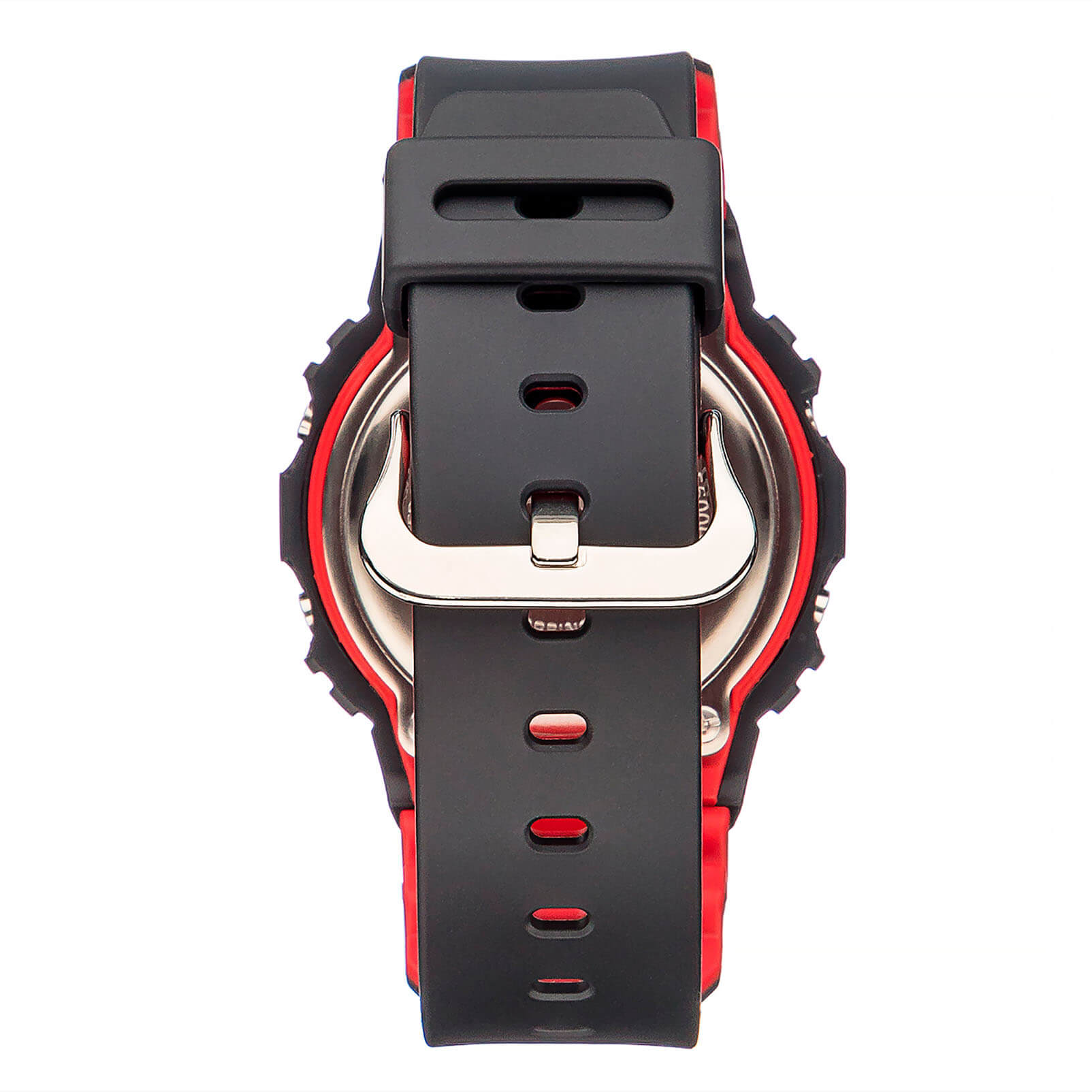 Модель Black & Red представлена в чёрном матовом исполнении, яркой деталью стала красная внутренняя сторона ремешка из дополнительного полимерного слоя. Такой акцент придаёт аксессуару некую динамику и спортивный накал. Наручные часы с инверсионным дисплеем имеют базовый функционал: таймер с автоповтором, секундомер, будильник, хронографХронографФункция позволяет измерять отрезки времени с особой точностью: часы, минуты, секунды. Верным признаком хронографа является наличие на циферблате 3 дополнительных окошек-счётчиков., автоматический календарь до 2099 года. Батарейка рассчитана на 2 года работы. Минеральное стекло. Электролюминесцентная подсветкаЭлектролюминесцентная подсветкаЭлектролюминесцентная панель устанавливается под ЖК-экраном часов, при нажатии кнопки электричество преобразуется в свет за счёт подачи напряжения на атомы фосфора, такой тип подсветки позволяет освещать весь циферблат. циферблата. Водостойкость до 20 бар. 12/24-часовое отображение времени. Габариты: 48,9 x 42,8 x 13,4 мм.