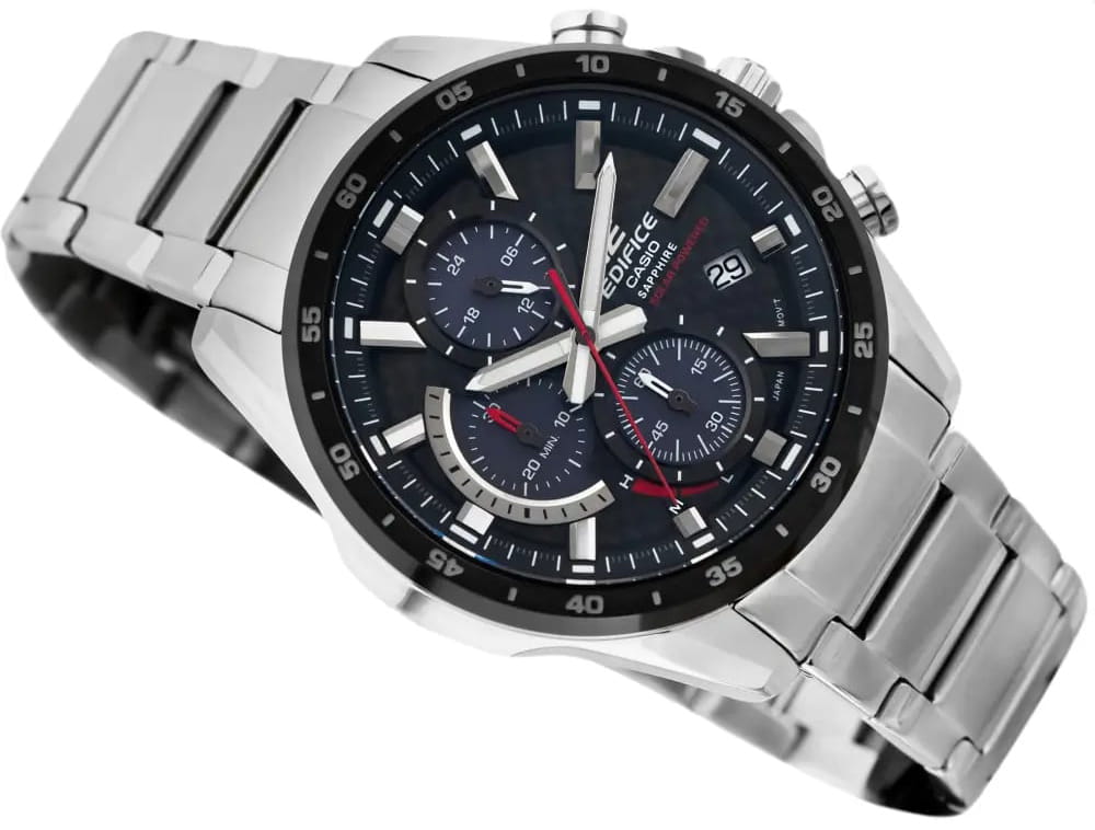 Габаритные наручные часы станут ключевой деталью для повседневного образа, привлекательно выглядят элементы красного цвета. Интерес вызывает необычный тёмный циферблат, имеющий карбоновую текстуру, переплетённые волокна образуют оригинальный узор. Ударопрочный корпусУдаропрочный корпусМеханизм заключён в корпус, выполненный из современных материалов, устойчивых к ударам, механическим повреждениям и падению с высоты: инновационный пластик, карбон, нержавеющая сталь, титан. и браслет на раскладной застёжкеРаскладная застёжкаТакой тип застёжки используется только на браслетах из металла. Она никогда не раскрывается полностью, происходит разделение на 2 и более частей. Раскладывающая застёжка снизит вероятность потери часов к минимуму. сделаны из стали 316L с антикоррозионными свойствами, за счёт чего часы надолго сохранят безупречный внешний вид. Модель получает питание от солнечного света Tough SolarTough SolarТехнология основана на подзарядке аккумулятора от источника солнечного света, специальная панель улавливает солнечные лучи и преобразует их в энергию для работы часов. Достаточно пары минут нахождения на солнце для функционирования часов в течении суток., состояние заряда можно отслеживать благодаря наличию особого индикатора. БезельБезельВнешний ободок, закрепляющий стекло. В спортивных часах так называется поворотное кольцо с делениями на циферблате, выполняет роль таймера – замеряет отрезки времени на шкале. Неподвижный безель – элемент декора. Однонаправленно вращающийся безель на дайверских часах позволяет фиксировать моменты погружения и выныривания на поверхность. с чёрным IP-покрытиемIP-покрытиеМетод ионного напыления. Демонстрирует повышенную устойчивость к истиранию, окислению и химическим веществам. Под воздействием высокого давления и температуры около 1500°C молекулы металла надёжно соединяются с частицами корпуса часов.. Закручивающаяся крышка с резьбовым соединением. Водонепроницаемость 100 метров. Подсветка NeobriteПодсветка NeobriteИспользование светонакопительных составов на основе сульфида цинка или алюмината стронция, яркий свет можно наблюдать на протяжении 6-10 часов после «зарядки» часов около источника света.. Сапфировое стеклоСапфировое стеклоПрочный и надёжный материал из кристалла сапфира синтетического происхождения, характеризующийся особой твёрдостью и устойчивостью к царапинам и повреждениям.. Часы-хронографХронографФункция позволяет измерять отрезки времени с особой точностью: часы, минуты, секунды. Верным признаком хронографа является наличие на циферблате 3 дополнительных окошек-счётчиков. с секундомеромСекундомерСекундоме́р — прибор, способный измерять интервалы времени с точностью до долей секунды. с точностью показаний 1с и временем измерения 30мин. Габариты: 51,5 x 47,6 x 12 мм.
