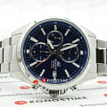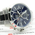Циферблат насыщенного синего цвета имеет крупную индикацию времени и секундную стрелку с оранжевым наконечником, что обеспечивает идеальную читаемость показателей. Высокоточный кварцевый механизм заключён в стальной ударопрочный корпусУдаропрочный корпусМеханизм заключён в корпус, выполненный из современных материалов, устойчивых к ударам, механическим повреждениям и падению с высоты: инновационный пластик, карбон, нержавеющая сталь, титан., из нержавеющей стали выполнен и браслет. Минеральное стекло устойчиво к появлению царапин. Водонепроницаемость 100 метров. Люминесцентная подсветкаЛюминесцентное покрытиеПозволяет считывать показания времени в темноте. Производители наносят на стрелки, часовые индексы, безель или поверхность циферблата светонакопительный состав, дающий холодное свечение.. ХронографХронографФункция позволяет измерять отрезки времени с особой точностью: часы, минуты, секунды. Верным признаком хронографа является наличие на циферблате 3 дополнительных окошек-счётчиков., секундомер, календарь. Габариты: 44 x 50 x 12 мм.