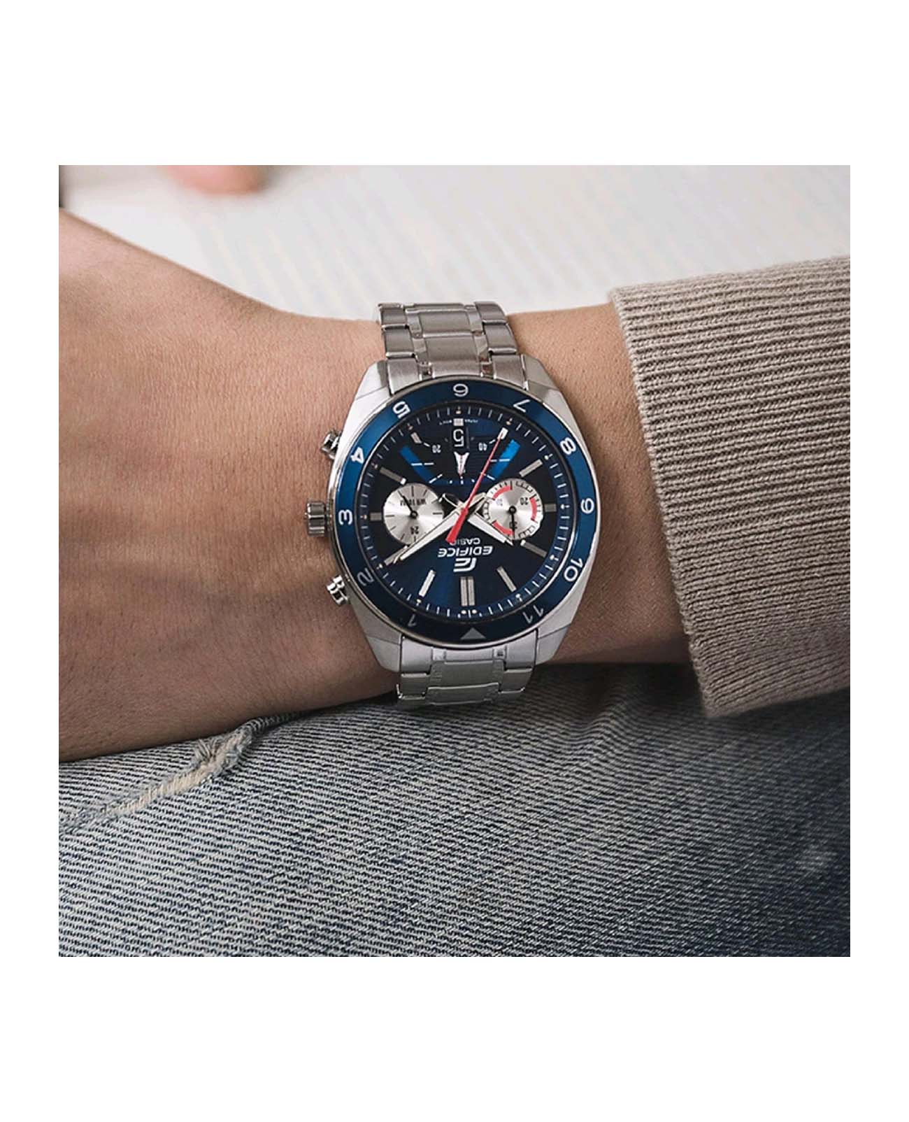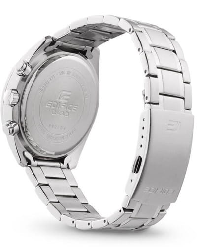 Японские мужские часы-хронографХронографФункция позволяет измерять отрезки времени с особой точностью: часы, минуты, секунды. Верным признаком хронографа является наличие на циферблате 3 дополнительных окошек-счётчиков. Casio Edifice EFV-590D-2AVUDF. Минеральное стеклоМинеральное стеклоМинеральное стекло представляет собой искусственно выращенный минерал кварца. Такое стекло отличается особой устойчивостью к повреждениям и царапинам. Уступает по некоторым качествам сапфировому стеклу. устойчивое к появлению царапин, обладающее высокой прозрачностью. Корпус часов изготовлен из нержавеющей стали. БезельБезельВнешний ободок, закрепляющий стекло. В спортивных часах так называется поворотное кольцо с делениями на циферблате, выполняет роль таймера – замеряет отрезки времени на шкале. Неподвижный безель – элемент декора. Однонаправленно вращающийся безель на дайверских часах позволяет фиксировать моменты погружения и выныривания на поверхность. из стали с IP-покрытиемIP-покрытиеМетод ионного напыления. Демонстрирует повышенную устойчивость к истиранию, окислению и химическим веществам. Под воздействием высокого давления и температуры около 1500°C молекулы металла надёжно соединяются с частицами корпуса часов.. Светодиодная автоподсветка NeobriteПодсветка NeobriteИспользование светонакопительных составов на основе сульфида цинка или алюмината стронция, яркий свет можно наблюдать на протяжении 6-10 часов после «зарядки» часов около источника света. - при повороте часов в сторону лица подсветка дисплея осуществляется автоматически. Настраиваемое послесвечение 1,5 или 3сек. СекундомерСекундомерСекундоме́р — прибор, способный измерять интервалы времени с точностью до долей секунды. с точностью измерения 1/100 секунды и измерением до 23 часов 59 минут 59,99 cек. ТаймерТаймерОтсчитывает секунды в обратном направлении в заданном интервале времени. обратного отсчета (диапазон времени 24 часа), автоматический календарь, 12/24 отображение времени. Класс водозащиты: 100 метров, позволит плавать, нырять и заниматься другими водными видами спорта. Стальной браслет на раскладной застёжкеРаскладная застёжкаТакой тип застёжки используется только на браслетах из металла. Она никогда не раскрывается полностью, происходит разделение на 2 и более частей. Раскладывающая застёжка снизит вероятность потери часов к минимуму..