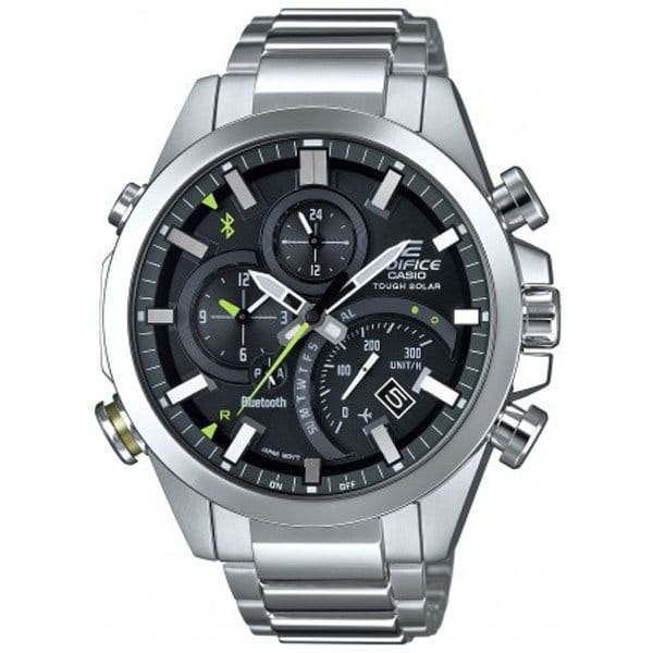 Общее исполнение аксессуара выдержано в автомобильной стилистике, тёмный циферблат отличается оригинальным расположением счётчиков. Наручные часы оснащены технологией BluetoothBluetoothСовременная технология, позволяющая синхронизировать часы с телефоном и переносить данные. Часы с Bluetooth расширяют возможности вашего смартфона и делают его использование ещё более удобным. с низким потреблением энергии, позволяющей часам считывать информацию с интернет-сервера точного времени и обеспечивать абсолютную точность времени. Питание происходит за счёт солнечной батареи - . Водонепроницаемость 100 метров. Минеральное стекло. Люминесцентная подсветкаЛюминесцентное покрытиеПозволяет считывать показания времени в темноте. Производители наносят на стрелки, часовые индексы, безель или поверхность циферблата светонакопительный состав, дающий холодное свечение.. Надёжный стальной браслет. Наличие авиарежима. Функции: уведомление о полученных сообщениях по электронной почте, поиск телефона, отображение числа и дня недели, секундомер, будильник, расчёт средней скорости пройденного маршрута. Габариты: 52 x 48,1 x 14,2 мм.