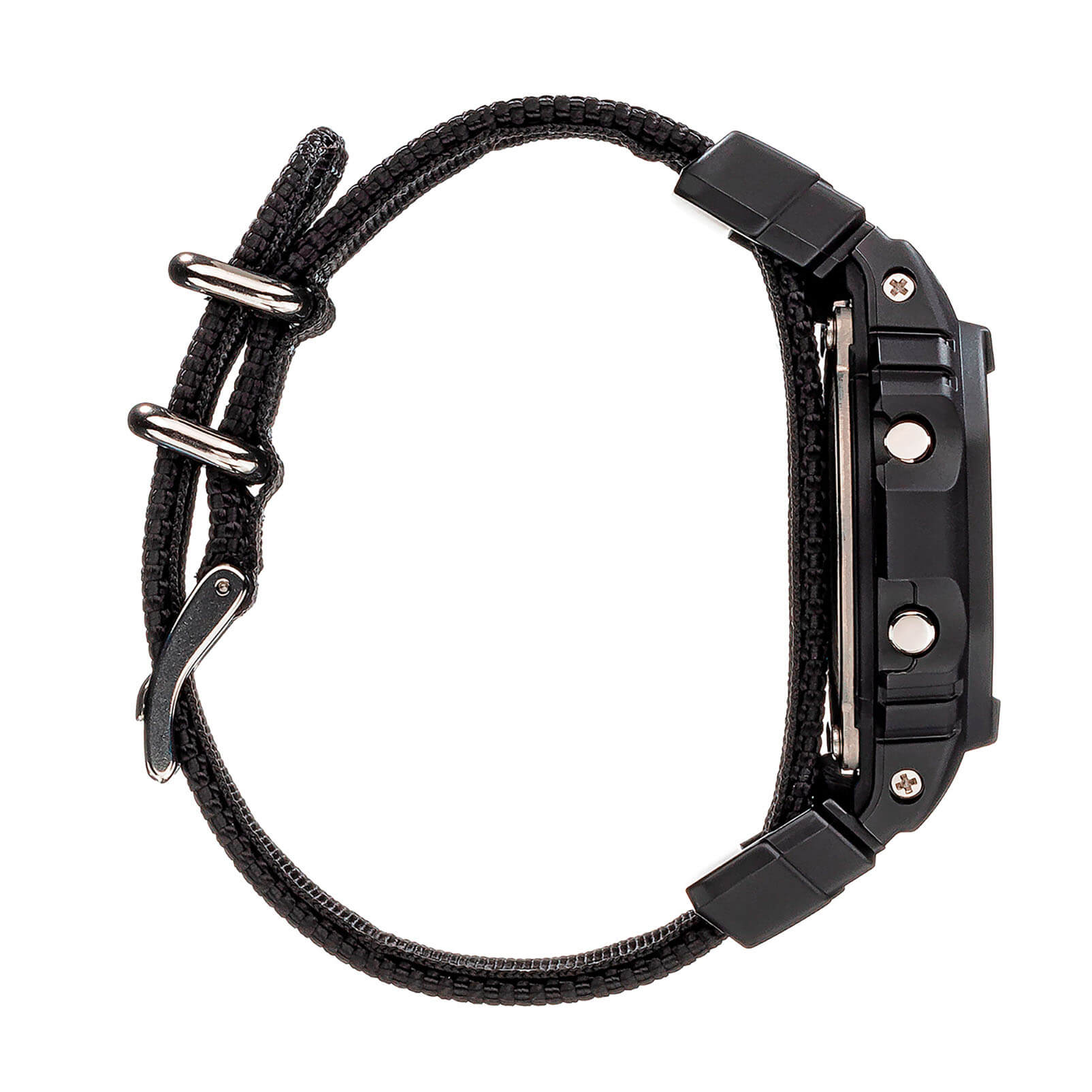 Брендовая модель отличается компактными размерами, что позволяет ей идеально сидеть на руке. Лаконичности добавляет и 8-угольный противоударный корпусУдаропрочный корпусМеханизм заключён в корпус, выполненный из современных материалов, устойчивых к ударам, механическим повреждениям и падению с высоты: инновационный пластик, карбон, нержавеющая сталь, титан. в матовом чёрном исполнении, сделанный из надёжного пластика. Минеральное стекло. Стильный нейлоновый браслет, разработанный совместно с Cordura®. Электролюминесцентная подсветкаЭлектролюминесцентная подсветкаЭлектролюминесцентная панель устанавливается под ЖК-экраном часов, при нажатии кнопки электричество преобразуется в свет за счёт подачи напряжения на атомы фосфора, такой тип подсветки позволяет освещать весь циферблат.. Водонепроницаемость до 20 бар. Отображение времени в 12/24-часовом формате. Секундомер, таймер с автоповтором, будильник, автоматический календарь. Габариты: 48,9 x 42,8 x 13,4 мм.