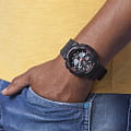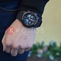 Светодиодная подсветкаСветодиодная подсветкаСветодиодная или LED-подсветка обеспечивает появление яркого холодного свечения за счёт LED-элементов - маленьких лампочек. Они потребляют минимальное количество энергии, чаще всего можно встретить 1 светодиод, в нижней части циферблата. равномерно освещает весь циферблат, облегчая считывание показаний в любых условиях освещения. Функция мирового времениМировое время Полезное часовое усложнение, отображающее время в основных городах и известных областях по всему миру, оно связано с часовыми поясами, удобно для путешественников и бизнесменов. позволяет отслеживать время в разных часовых поясах, а секундомерСекундомерСекундоме́р — прибор, способный измерять интервалы времени с точностью до долей секунды. с точностью измерения 1/100 секунды и максимальным временем 23 часа 59 минут 59,99 секунд помогает контролировать время.