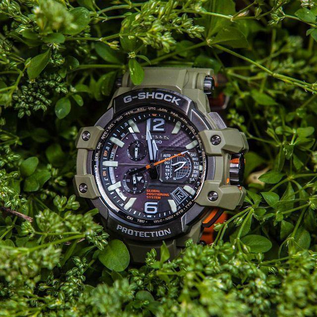Перед вами модель из флагманской серии G-SHOCK GPW в милитаристическом дизайне цвета хаки, черным стальным безелем и яркими оранжевыми деталями — это первые в мире часы с GPS- и радио-синхронизацией времени с атомными часами в разных частях света.