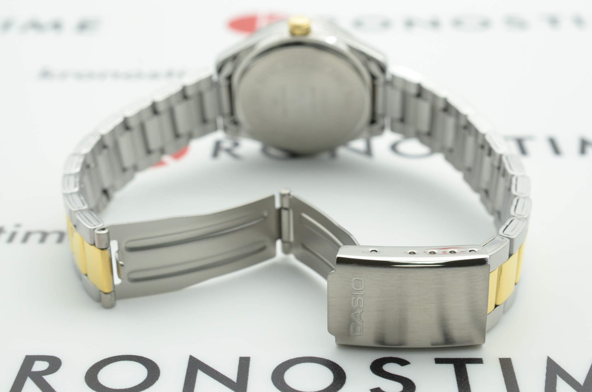 Японские женские кварцевые часы с минеральным стекломМинеральное стеклоМинеральное стекло представляет собой искусственно выращенный минерал кварца. Такое стекло отличается особой устойчивостью к повреждениям и царапинам. Уступает по некоторым качествам сапфировому стеклу. Casio Collection MTP-V004G-7B2, кварцевый механизм с высокой точностью. Практичные и удобные в использовании часы. Отличный аксессуар в стиле casual. Standard Analog. Корпус часов изготовлен из нержавеющей стали. Стрелки с необритовым покрытиемПодсветка NeobriteИспользование светонакопительных составов на основе сульфида цинка или алюмината стронция, яркий свет можно наблюдать на протяжении 6-10 часов после «зарядки» часов около источника света.. Необритовое светонакопительное покрытие обеспечивает длительное послесвечение в темноте даже после кратковременного нахождения на свету. Окошко даты находится в положении 3 часа. Класс водозащиты: 50 метров, позволит защитить корпус от случайных брызг или капель дождя. Стальной браслет с IP-покрытиемIP-покрытиеМетод ионного напыления. Демонстрирует повышенную устойчивость к истиранию, окислению и химическим веществам. Под воздействием высокого давления и температуры около 1500°C молекулы металла надёжно соединяются с частицами корпуса часов. на раскладной застёжкеРаскладная застёжкаТакой тип застёжки используется только на браслетах из металла. Она никогда не раскрывается полностью, происходит разделение на 2 и более частей. Раскладывающая застёжка снизит вероятность потери часов к минимуму..