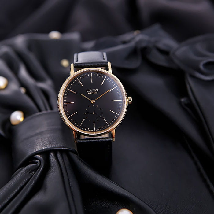 Удобные, стильные наручные часы от Casio являются воплощением практичности и элегантного дизайна. Круглый, золотой корпус выполнен из нержавеющей стали. Стильный черный ремень сделан из натуральной кожи. Сохранность часов обеспечивается прочным сапфировым стеклом. Временные отметки представлены в виде золотистых штрихов. Миниатюрная секундная стрелка вынесена на отдельный циферблат. Тип механизма - кварцевый. Вес аксессуара равен 40 граммам.