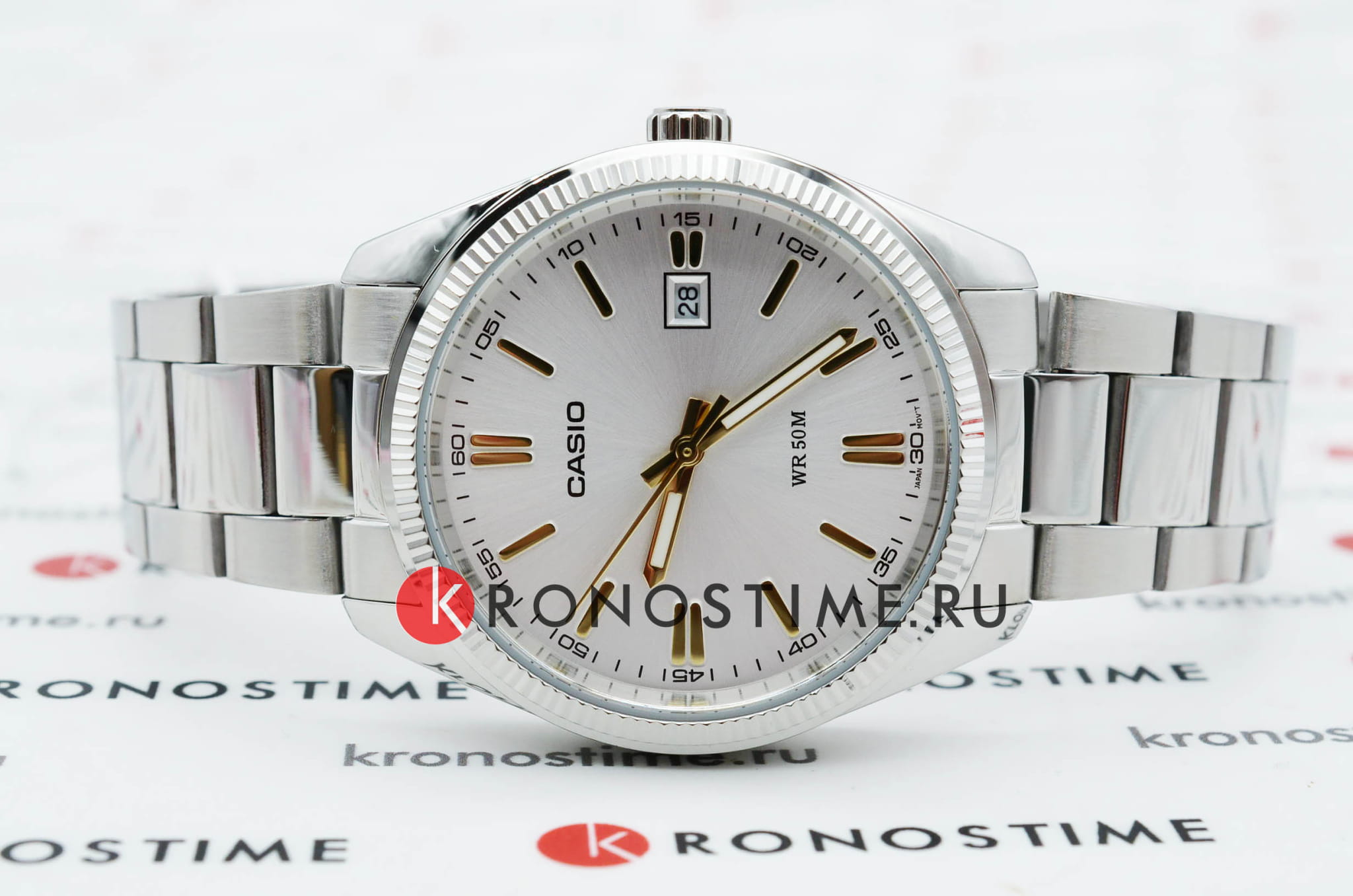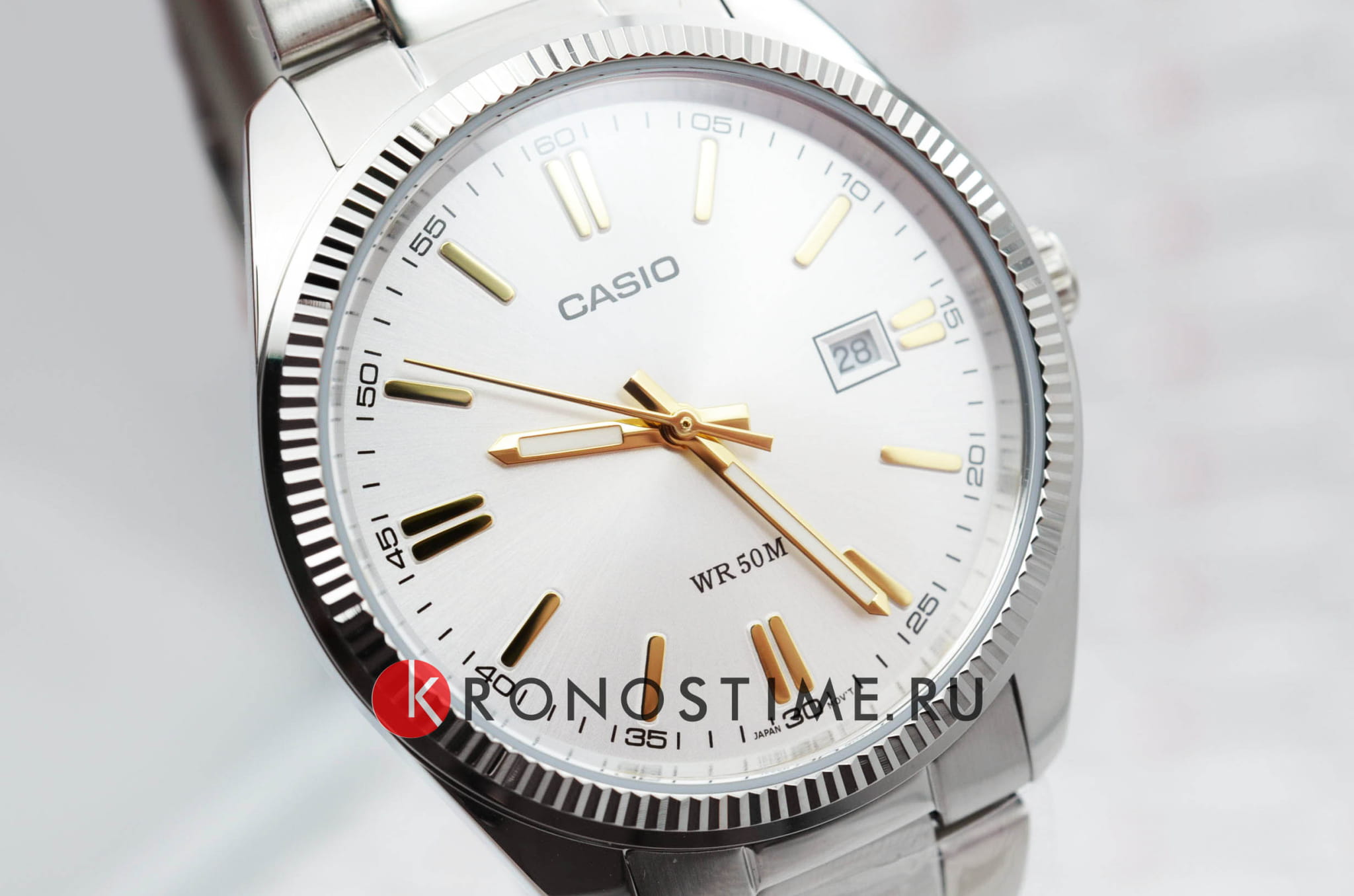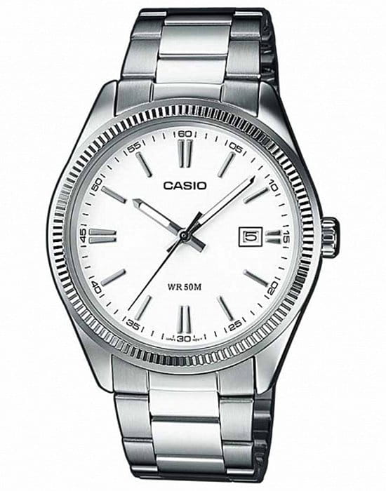 Лаконичный белый циферблат с серебристыми стрелками и метками никогда не утратит актуальности. Элегантности добавляет фактурный безельБезельВнешний ободок, закрепляющий стекло. В спортивных часах так называется поворотное кольцо с делениями на циферблате, выполняет роль таймера – замеряет отрезки времени на шкале. Неподвижный безель – элемент декора. Однонаправленно вращающийся безель на дайверских часах позволяет фиксировать моменты погружения и выныривания на поверхность.. Браслет сделан из нержавеющей стали 316L, отличающейся устойчивостью к царапинам и износу, для корпуса была выбрана гипоаллергенная латунь. Кварцевый механизм с высокой точностью хода. Водостойкость 50 метров. Стрелки с люминесцентным покрытиемЛюминесцентное покрытиеПозволяет считывать показания времени в темноте. Производители наносят на стрелки, часовые индексы, безель или поверхность циферблата светонакопительный состав, дающий холодное свечение.. Минеральное стекло. Апертура даты. Габариты: 44,2 x 38,5 x 9,2 мм.