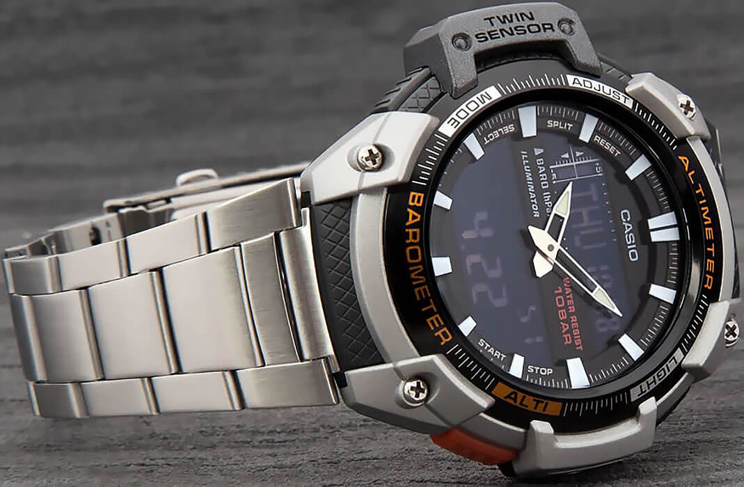 Аналоговый и цифровой вариант отображения времени, летнее/зимнее время, мировое время (есть Москва), секундомер (с возможностью учета времени круга и финиша двух спортсменов), таймер (без автоповтора), 5 будильников, сигнал начала часа, электролюминесцентная подсветка, барометр (погрешность 1-2 мм. рт. ст.), термометр (нужно снимать часы с руки, чтоб остывали), альтиметр (погрешность +/-20м), пластиковый корпус, металлический безель, пластиковое стекло, металлический браслет.