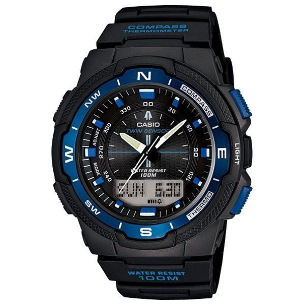 Многофункциональные часы круглой формы с аналогово-цифровым циферблатом черного цвета, обрамленным алюминиевым безелем цвета ночного неба. Черно-синий пластиковый корпус удерживается на руке черным пластиковым браслетом. Часы Casio SGW-500H-2B имеют светодиодную подсветку, встроенный цифровой компас, отображение возраста и фазы Луны, времени восхода и захода солнца, температурным датчиком, 5 будильниками и автоматическим календарем, указывающим число, день недели, месяц и год. Корпус - Алюминий; Стекло - Пластик; Водозащита - 100 м. (WR 100); Материал ремешка - Пластиковый; Цвет ремешка - Черный; Цвет циферблата - Черный.